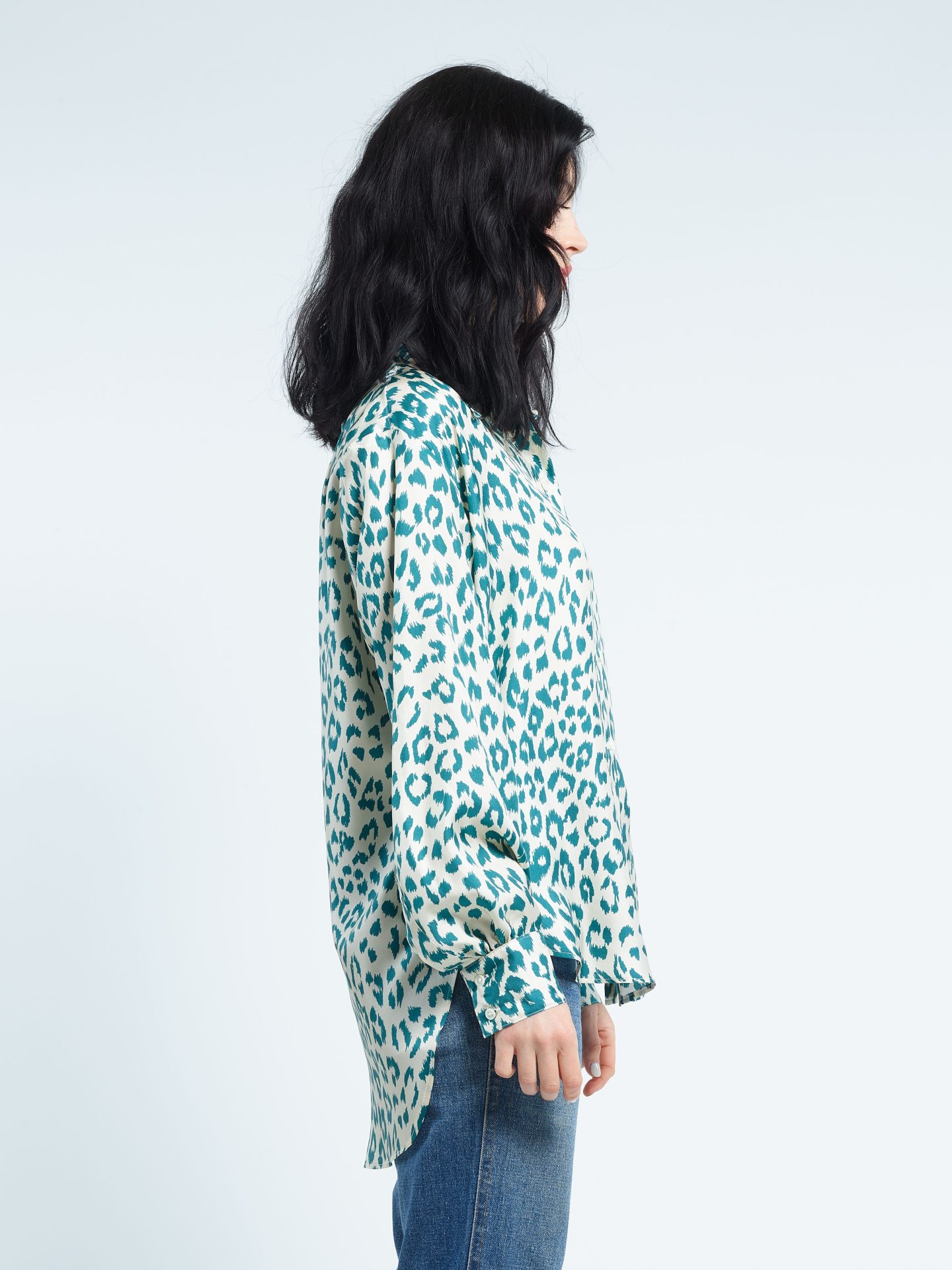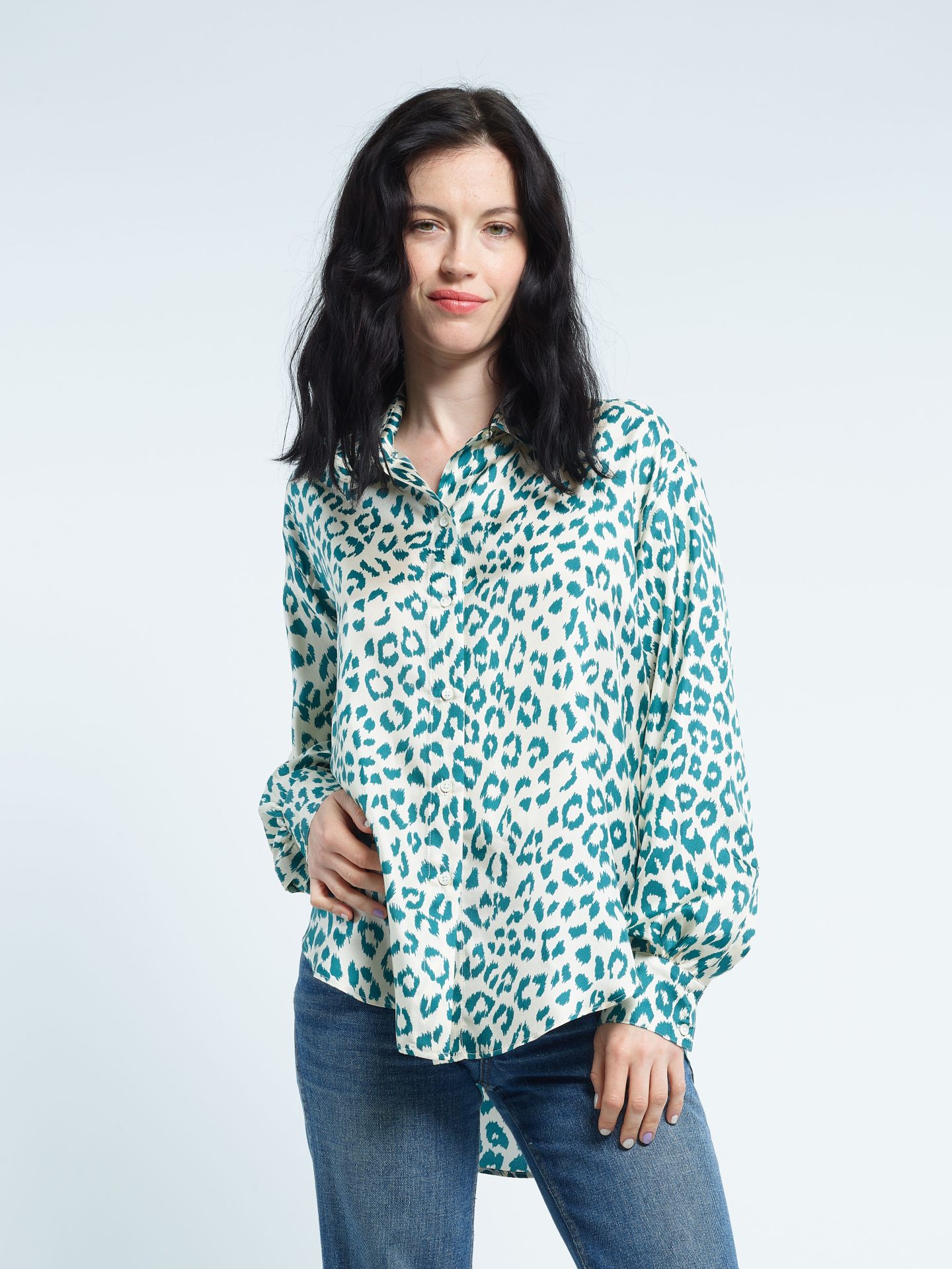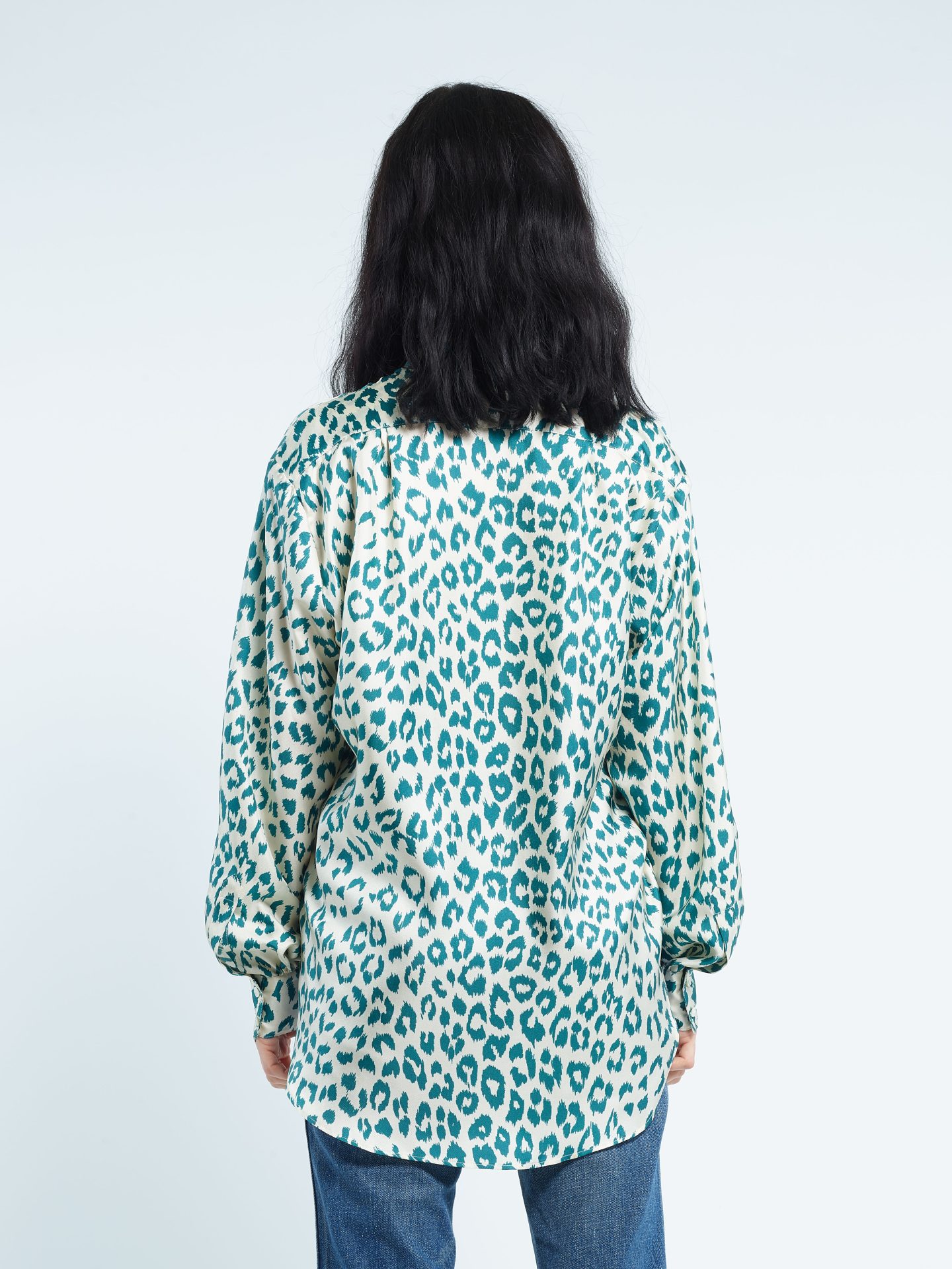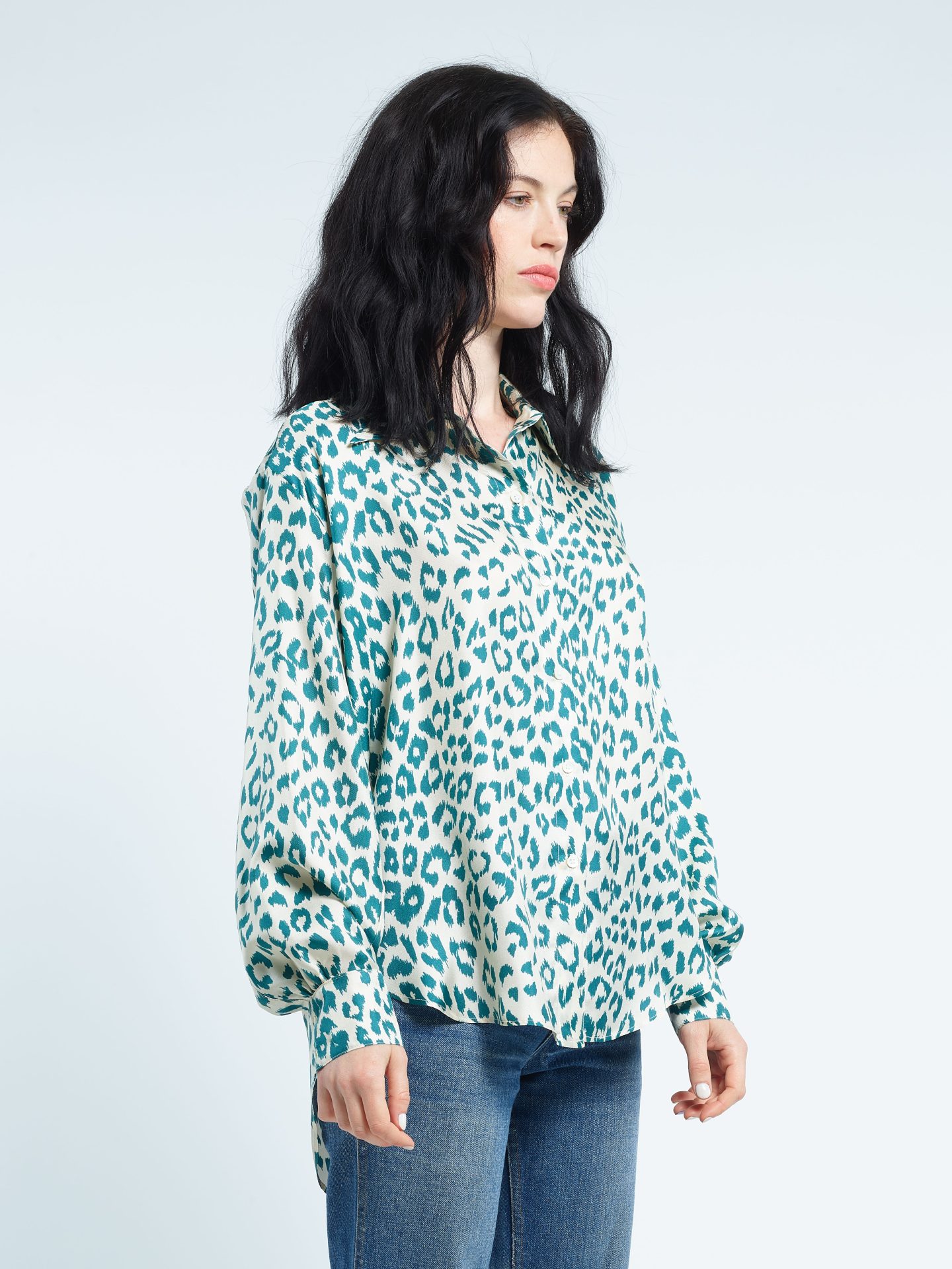 Oversized shirt with long sleeves, fully buttoned, mother-of-pearl buttons, all in silk twill. Exclusive “panther” print.