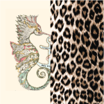 Small bag in silk twill fully lined in cotton, handles in leather cord, exclusive prints “Palm trees” and “Seahorses” based on Laurence Kiberlain’s drawings.