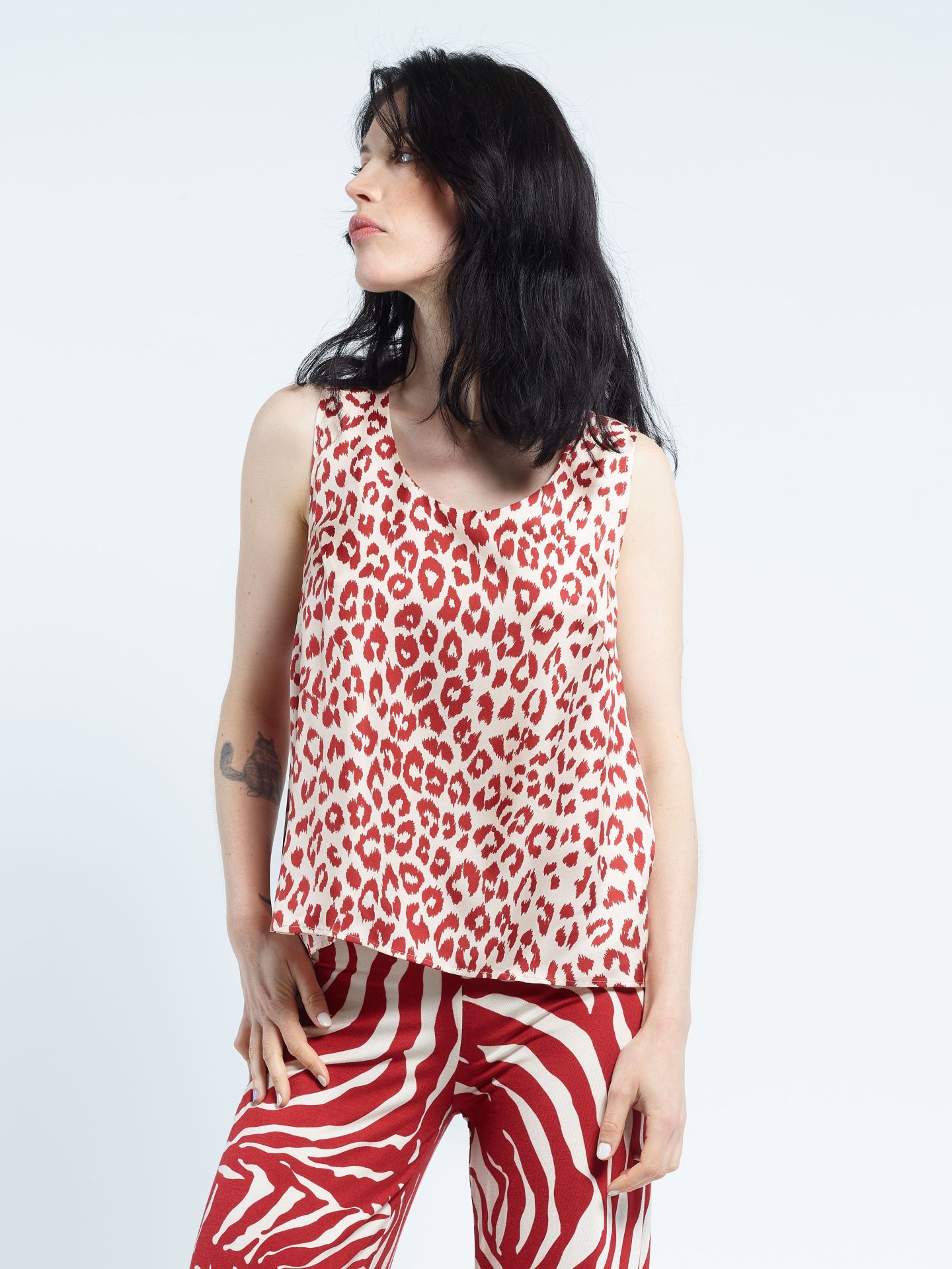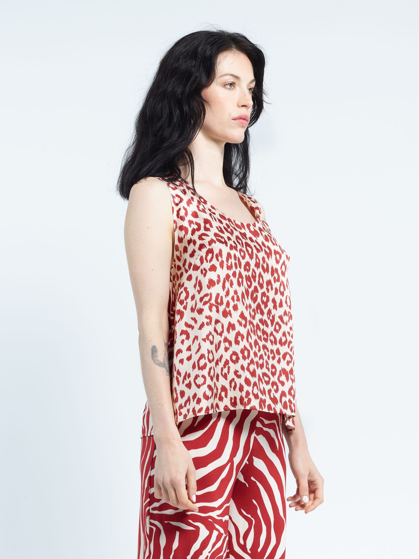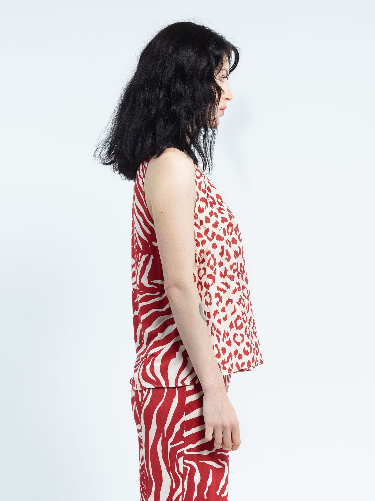 Biface tank top, front in silk twill, back in viscose jersey. Exclusive prints “Panther” and “Zebra”.