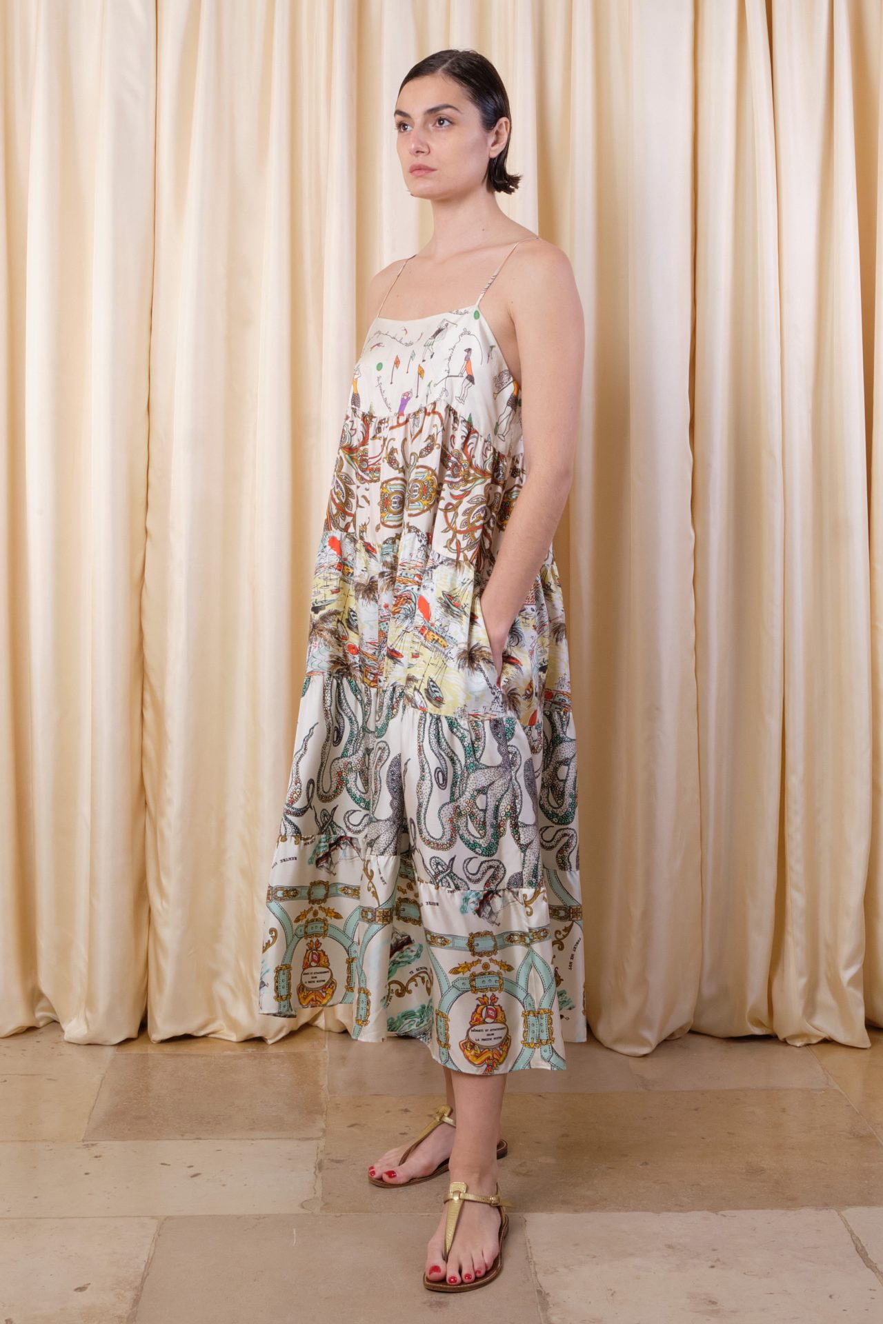 Sleeveless midi five-panneled dress with spaghetti straps, fully in silk twill, two gold buttons on the back. Exclusive print “Golfers” and “Octopus”, “Calcutta”, “La Dolce Vita” and “Attachement”.