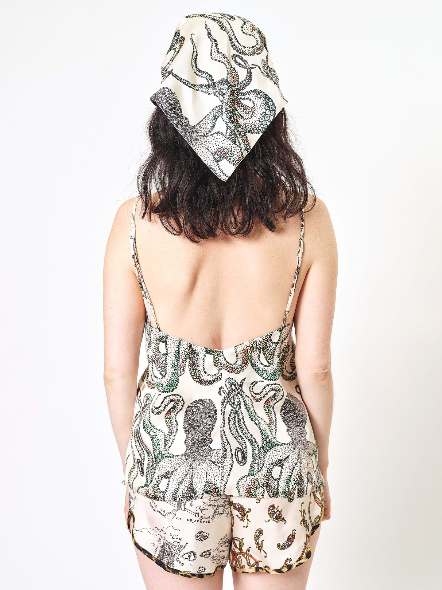 Tank top with spaghetti straps, fully reversible and fully in silk twill, exclusive prints “Attachement”, “Calcutta” and “Octopus” based on Laurence Kiberlain’s drawings.