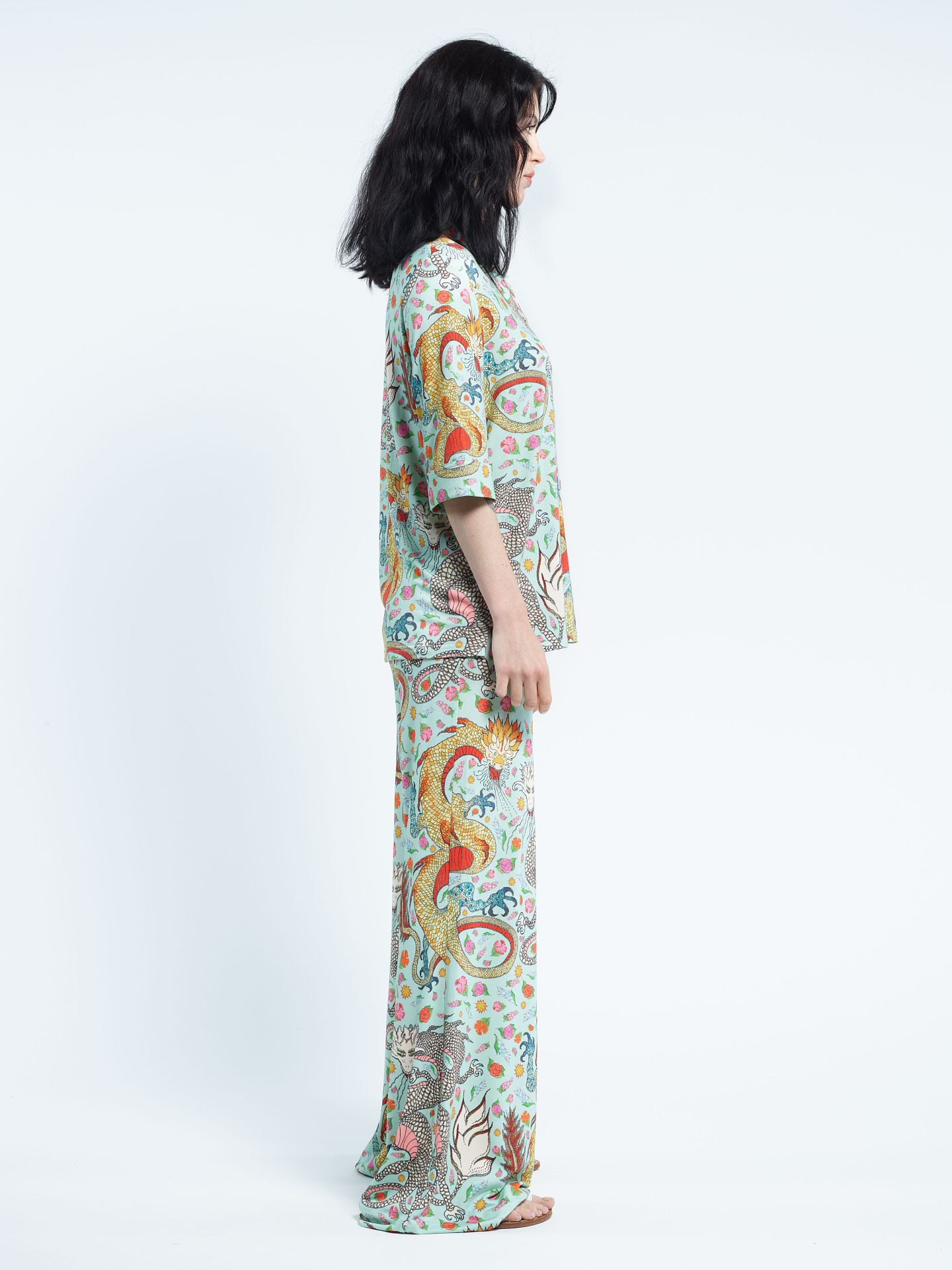 Natural-rise palazzo pants in viscose with wide legs that flare out from the waist. Zip fastened & mother-of-pearl button on the front. Exclusive print “Morocco Dragons” based on Laurence Kiberlain’s drawings.