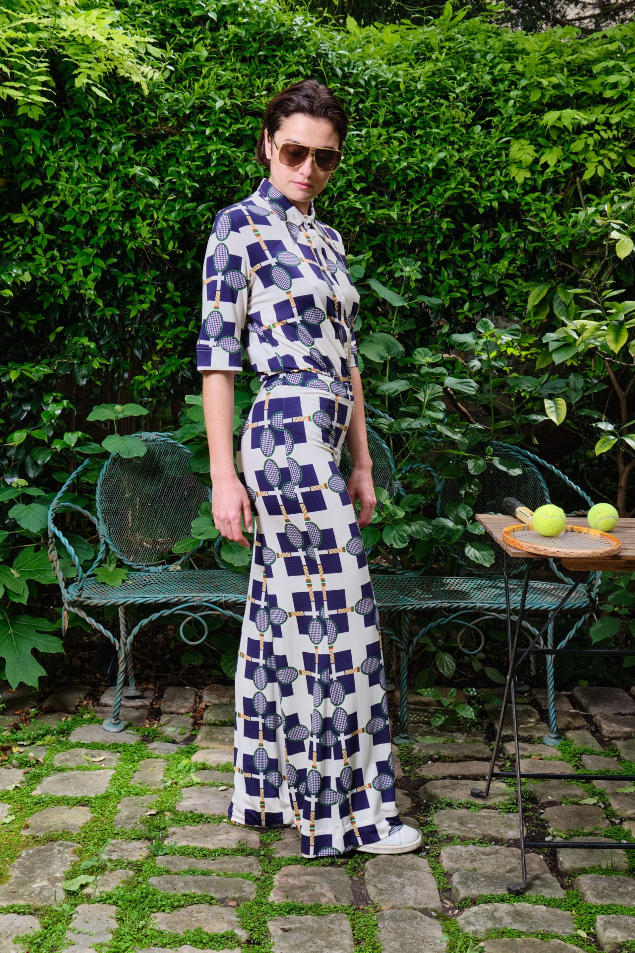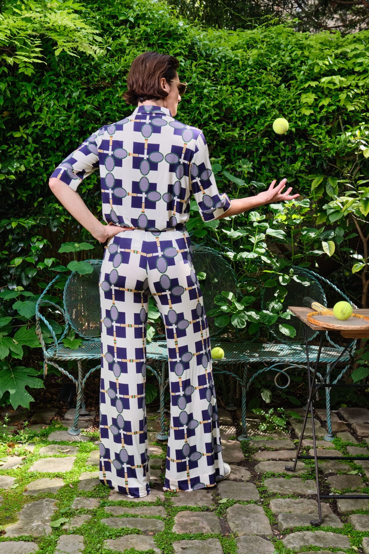 Natural-rise palazzo pants in viscose with wide legs that flare out from the waist. Zip fastened & mother-of-pearl button on the front. Exclusive print “Rackets”.