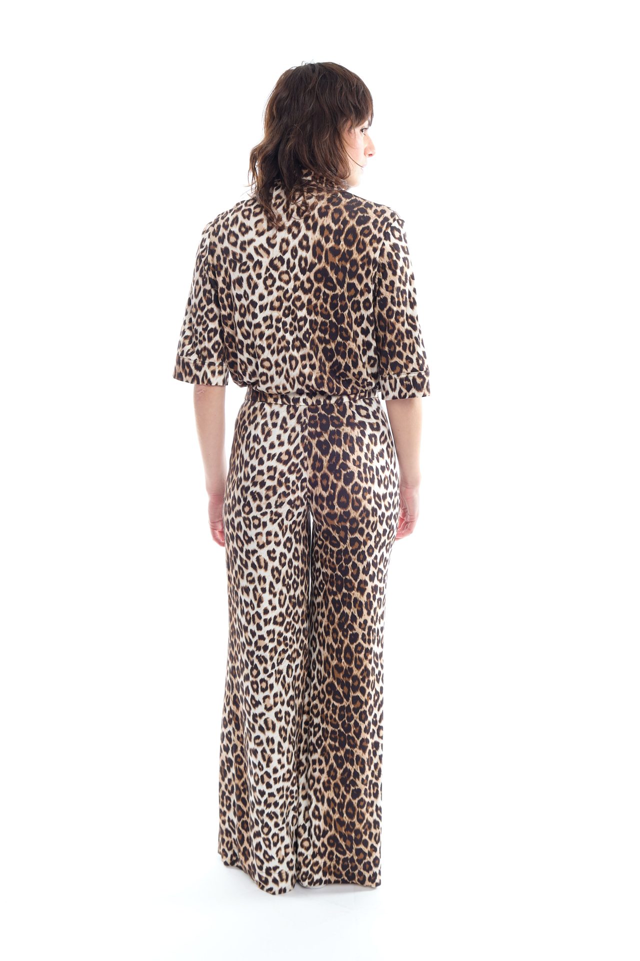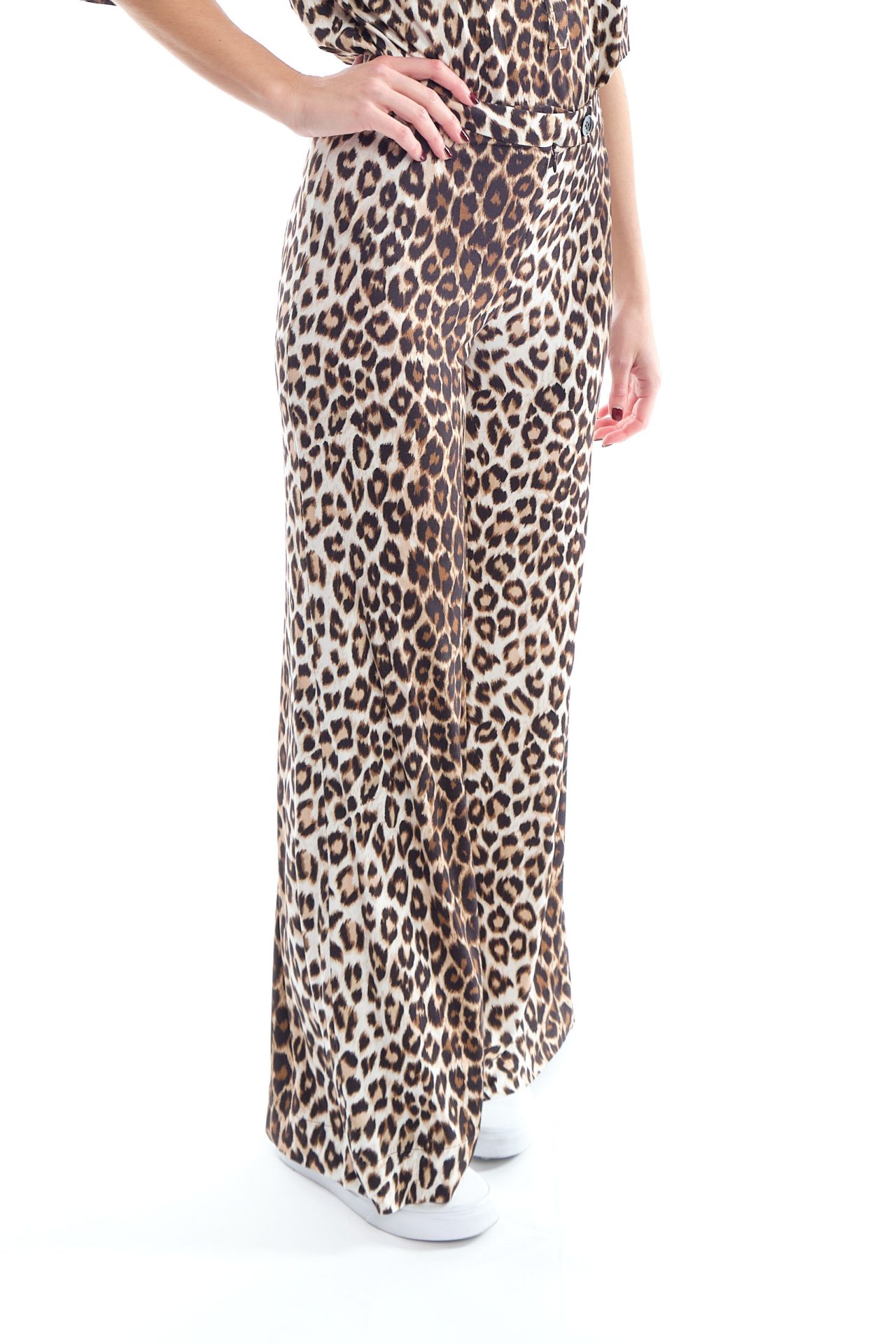 Natural-rise palazzo pants in viscose with wide legs that flare out from the waist. Zip fastened & mother-of-pearl button on the front. Exclusive print “Panther”.