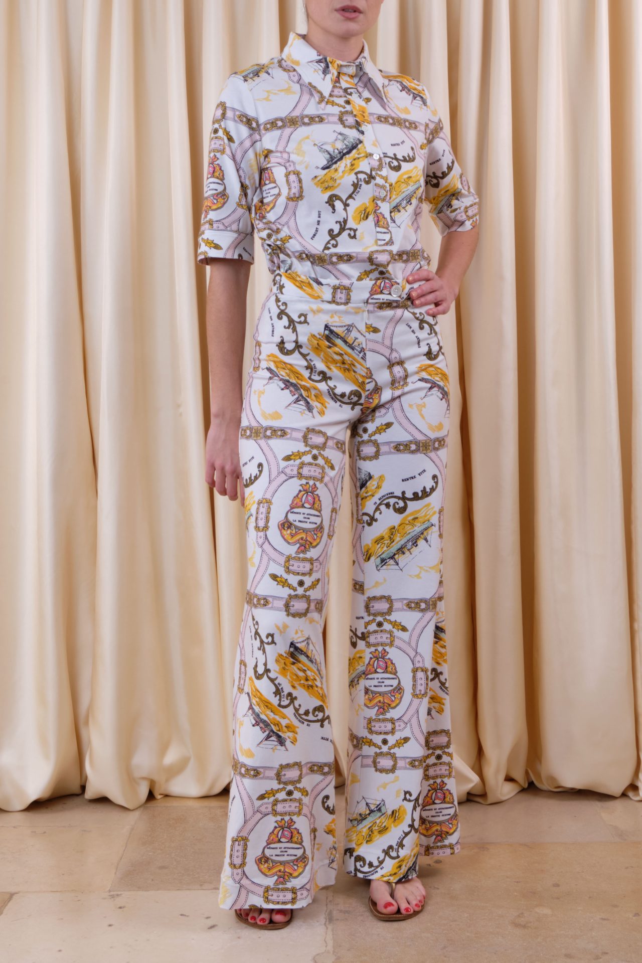 Natural-rise palazzo pants in viscose with wide legs that flare out from the waist. Zip fastened & mother-of-pearl button on the front. Exclusive print “Attachement”.