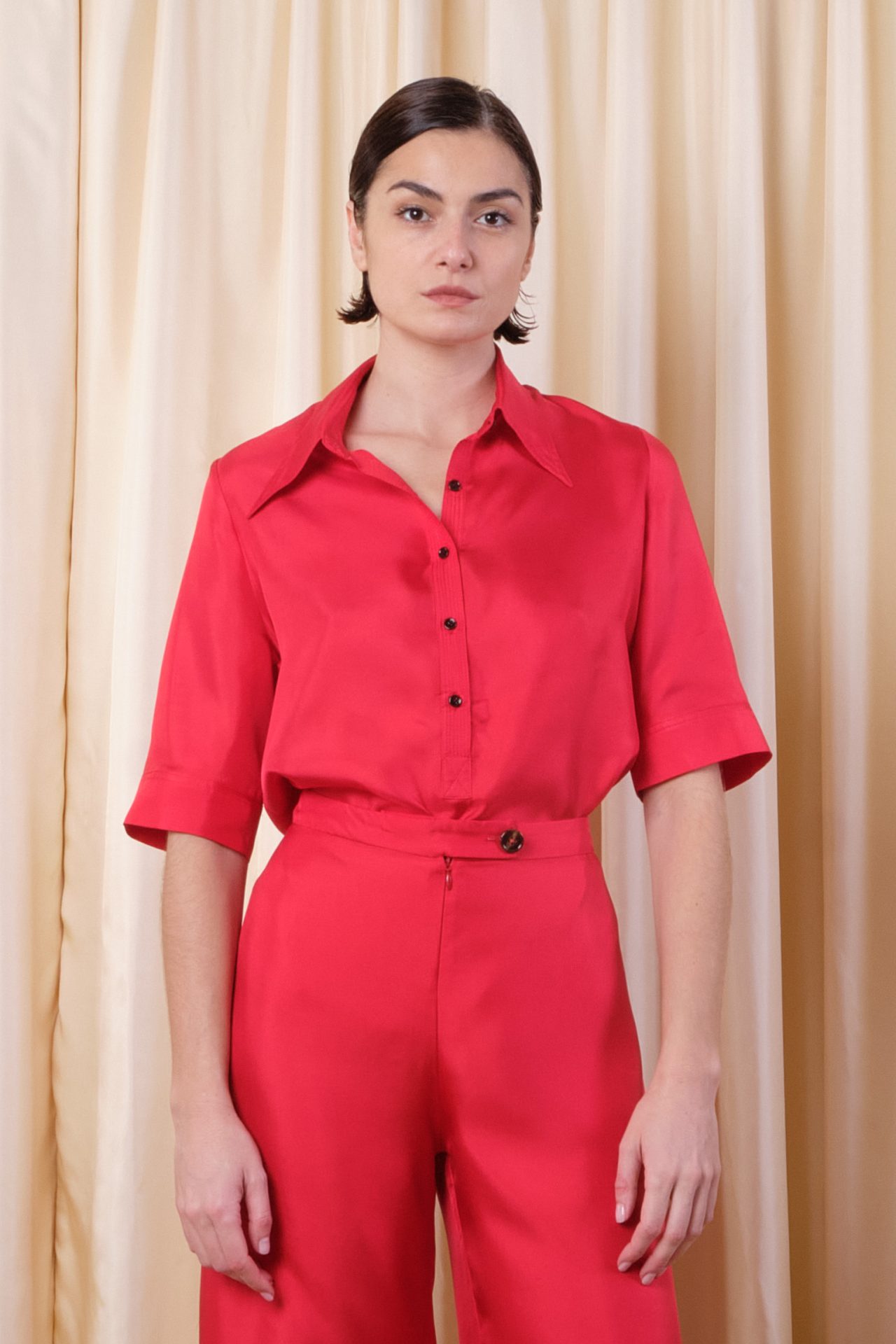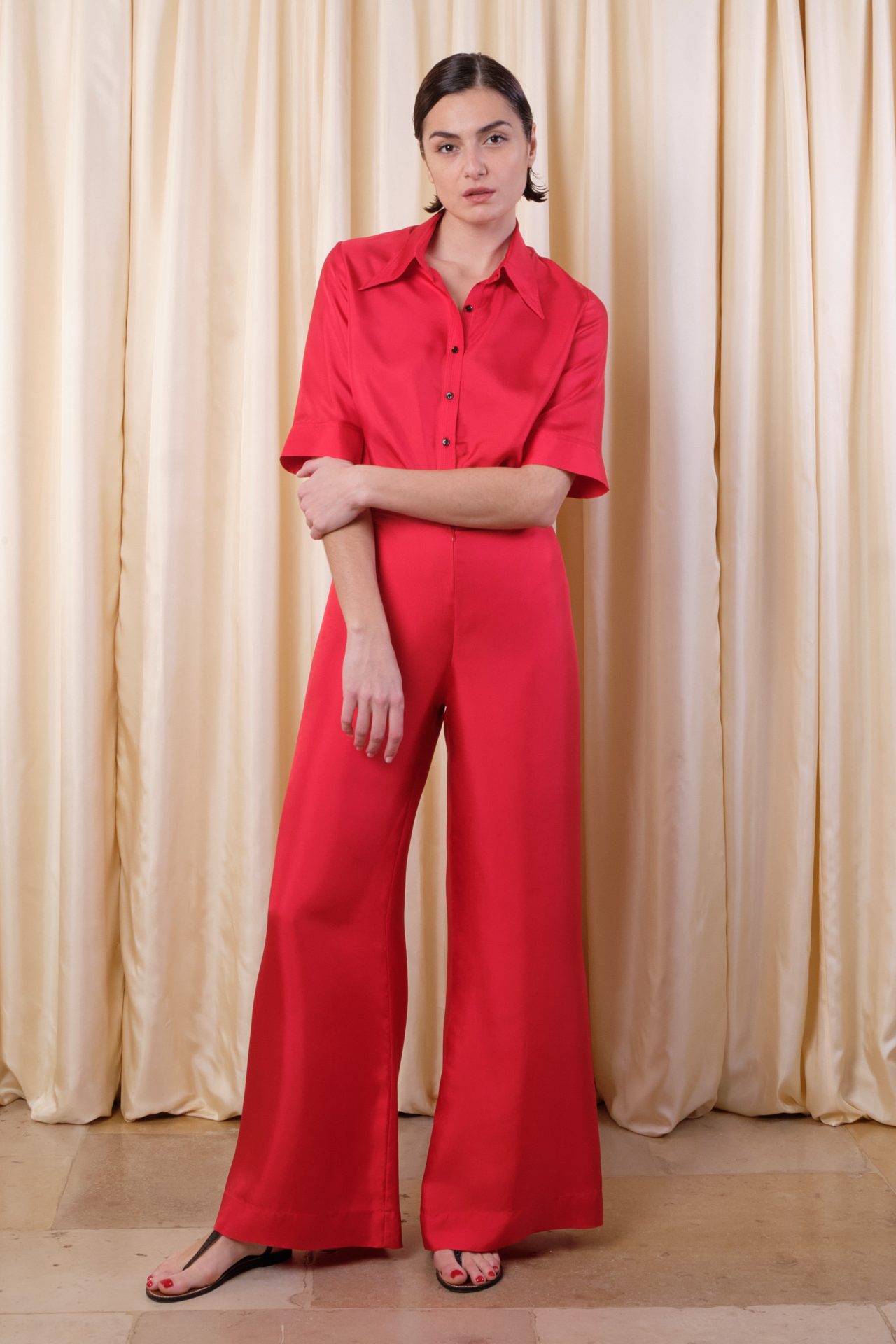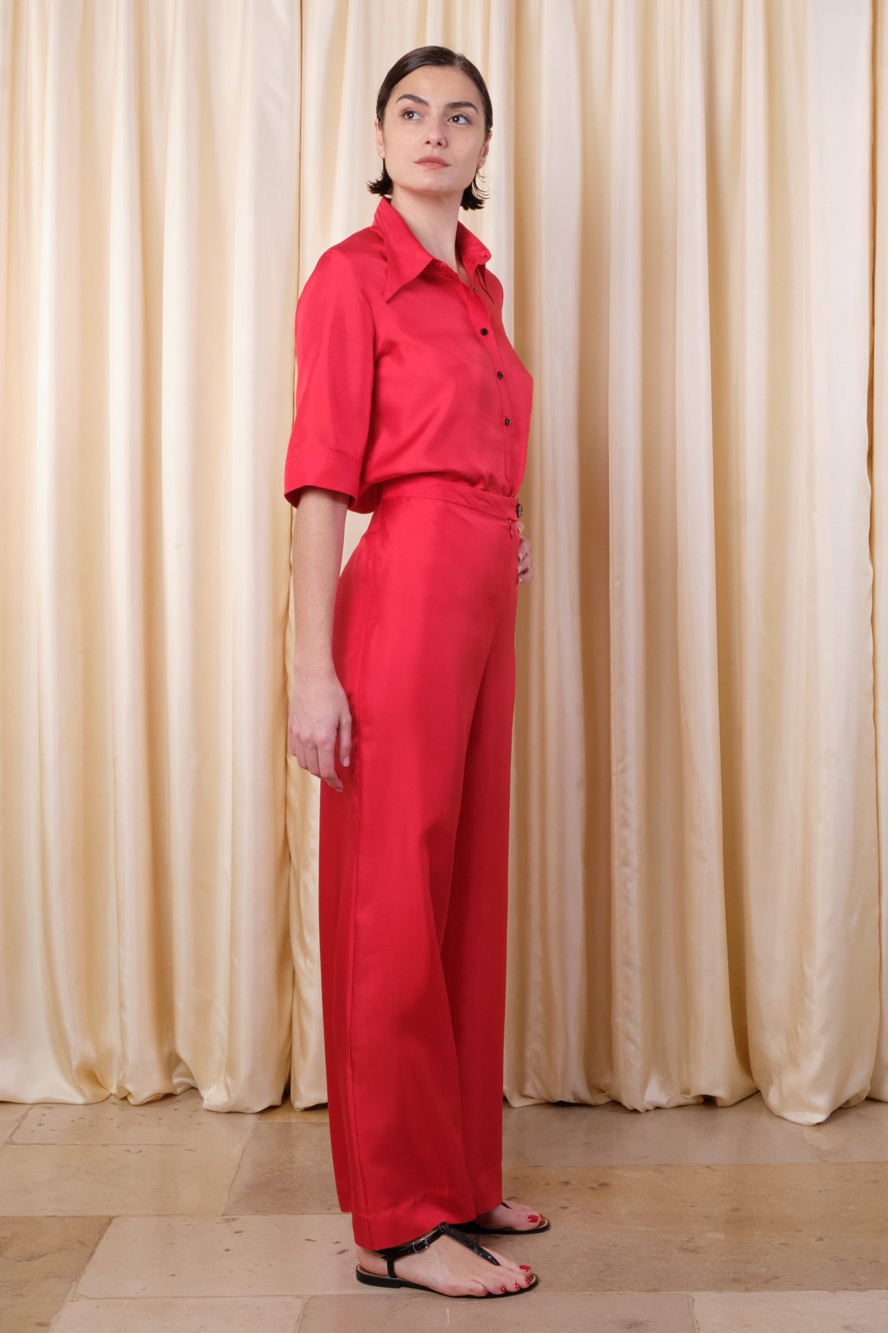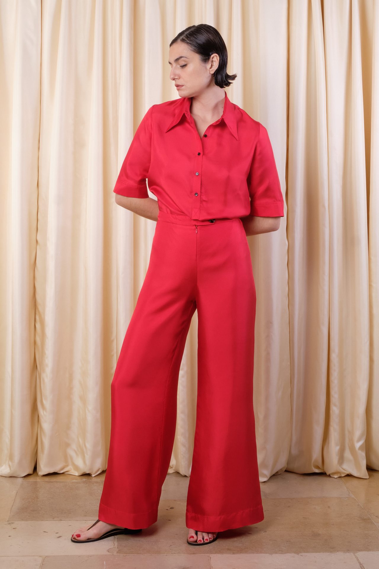 Natural-rise palazzo pants in silk twill with wide legs that flare out from the waist. Zip fastened & mother-of-pearl button on the front.