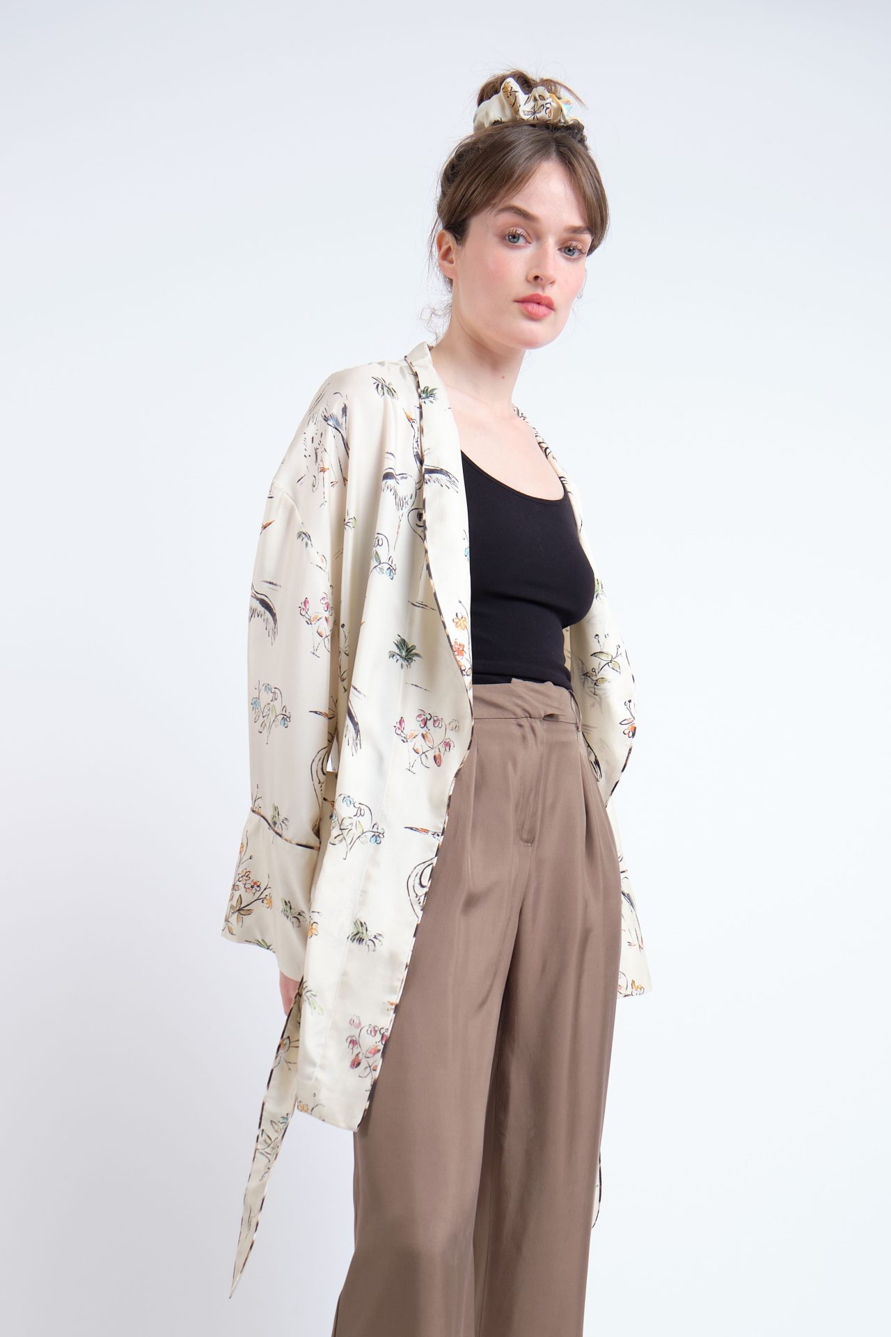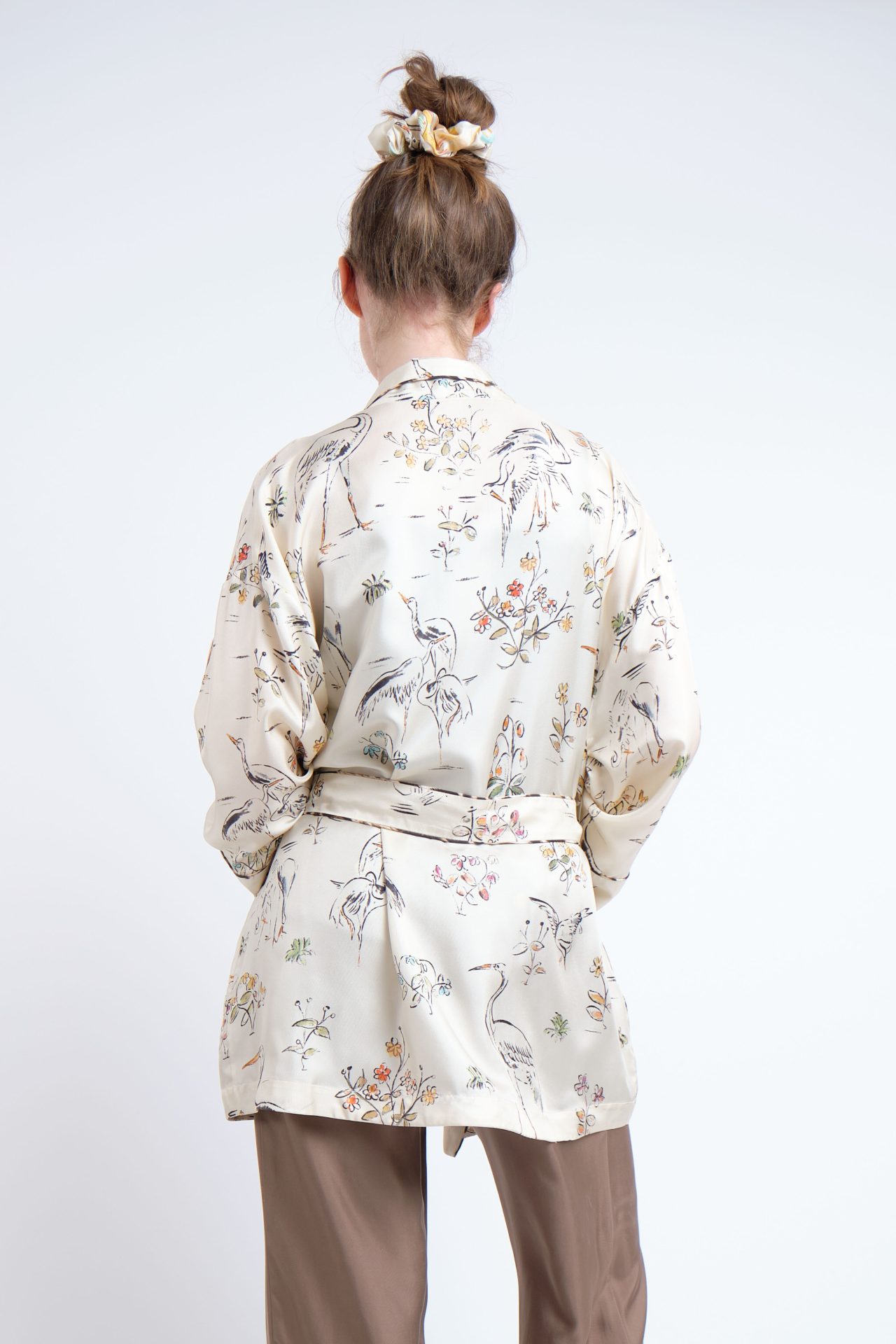 Mid-length kimono jacket, with patched pockets and belt, fully in silk twill. Exclusive print “Herons”, piping details in “Panther”.