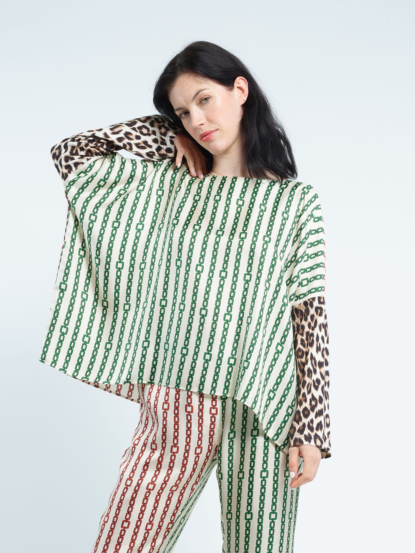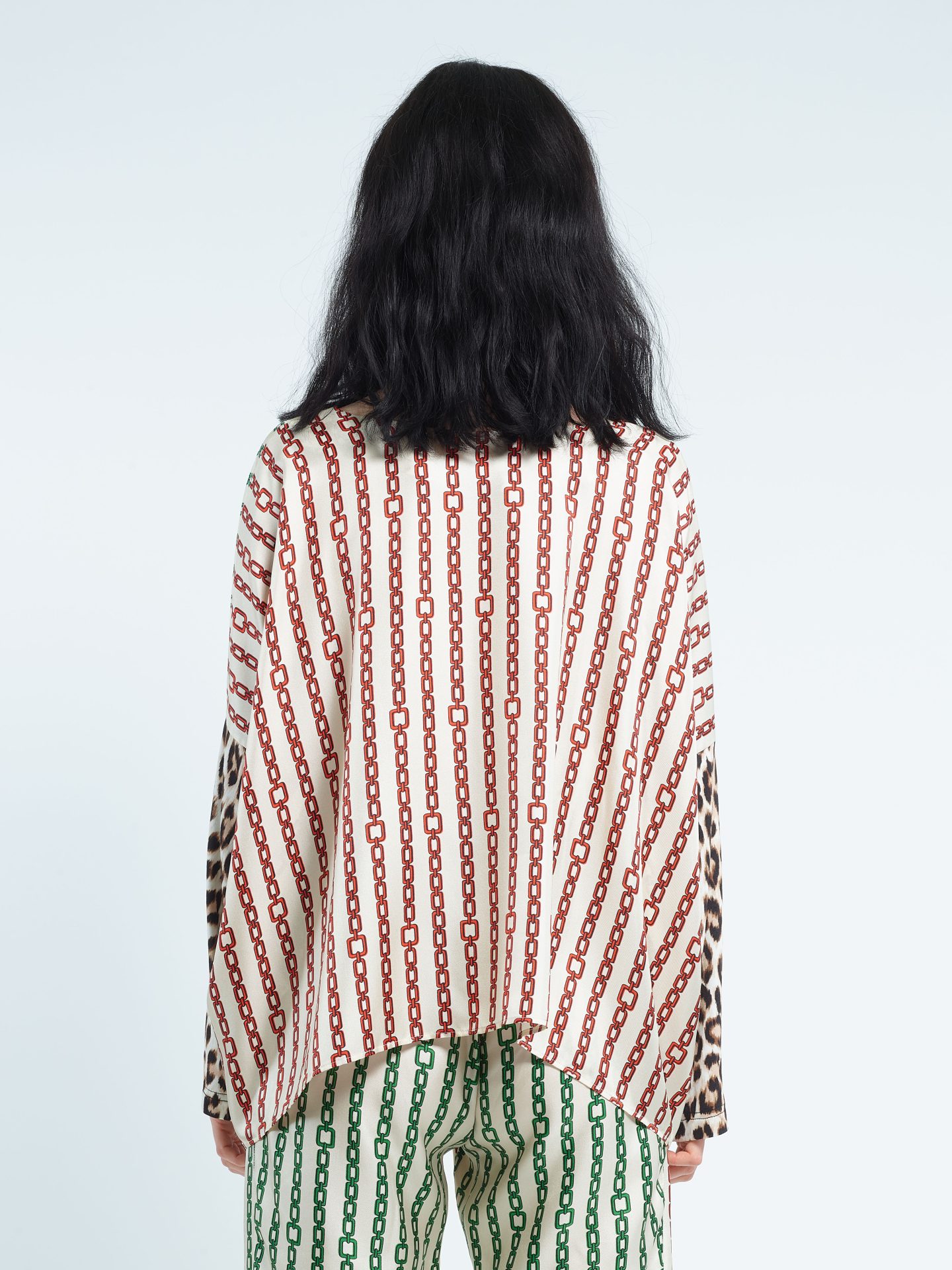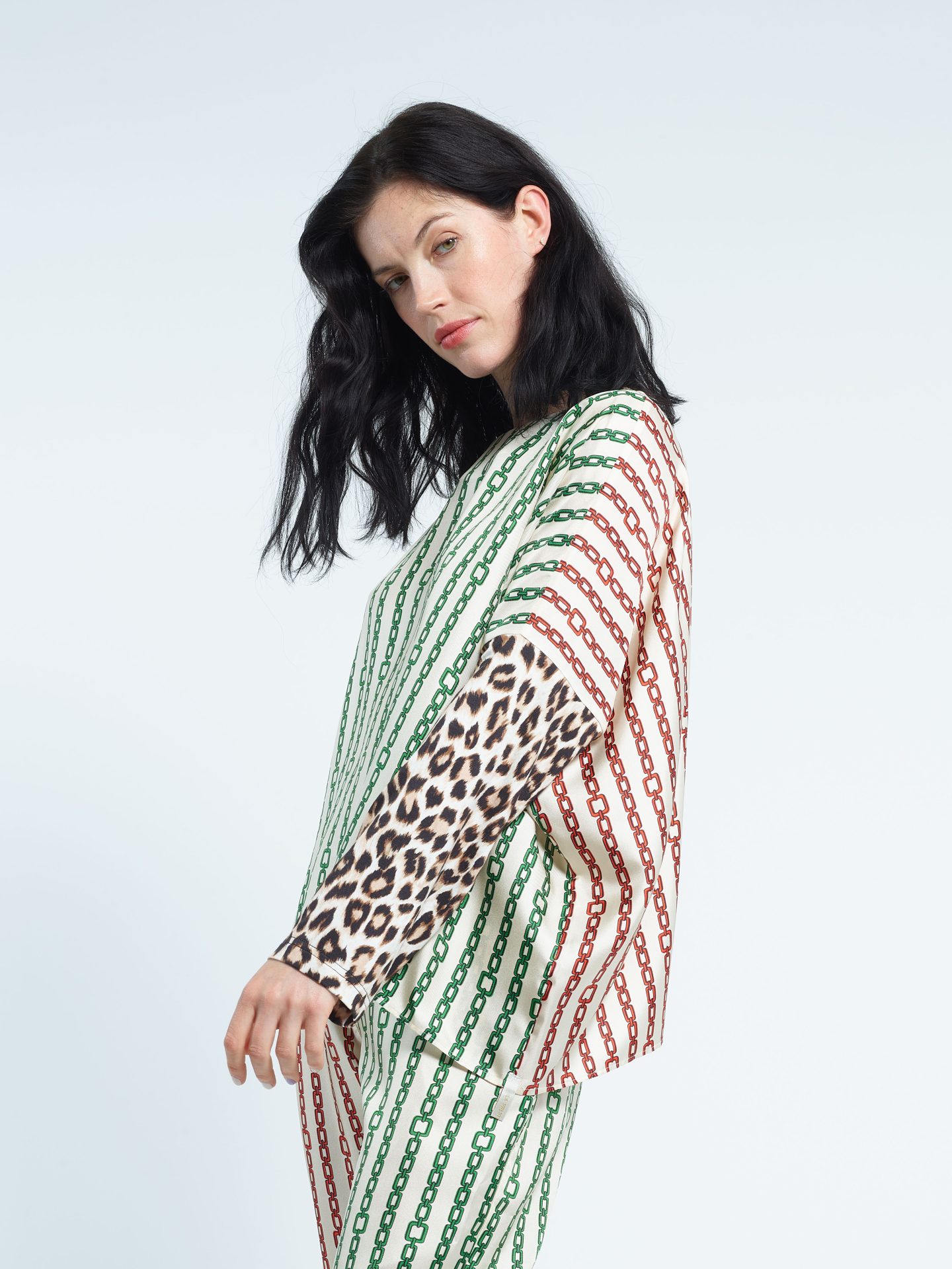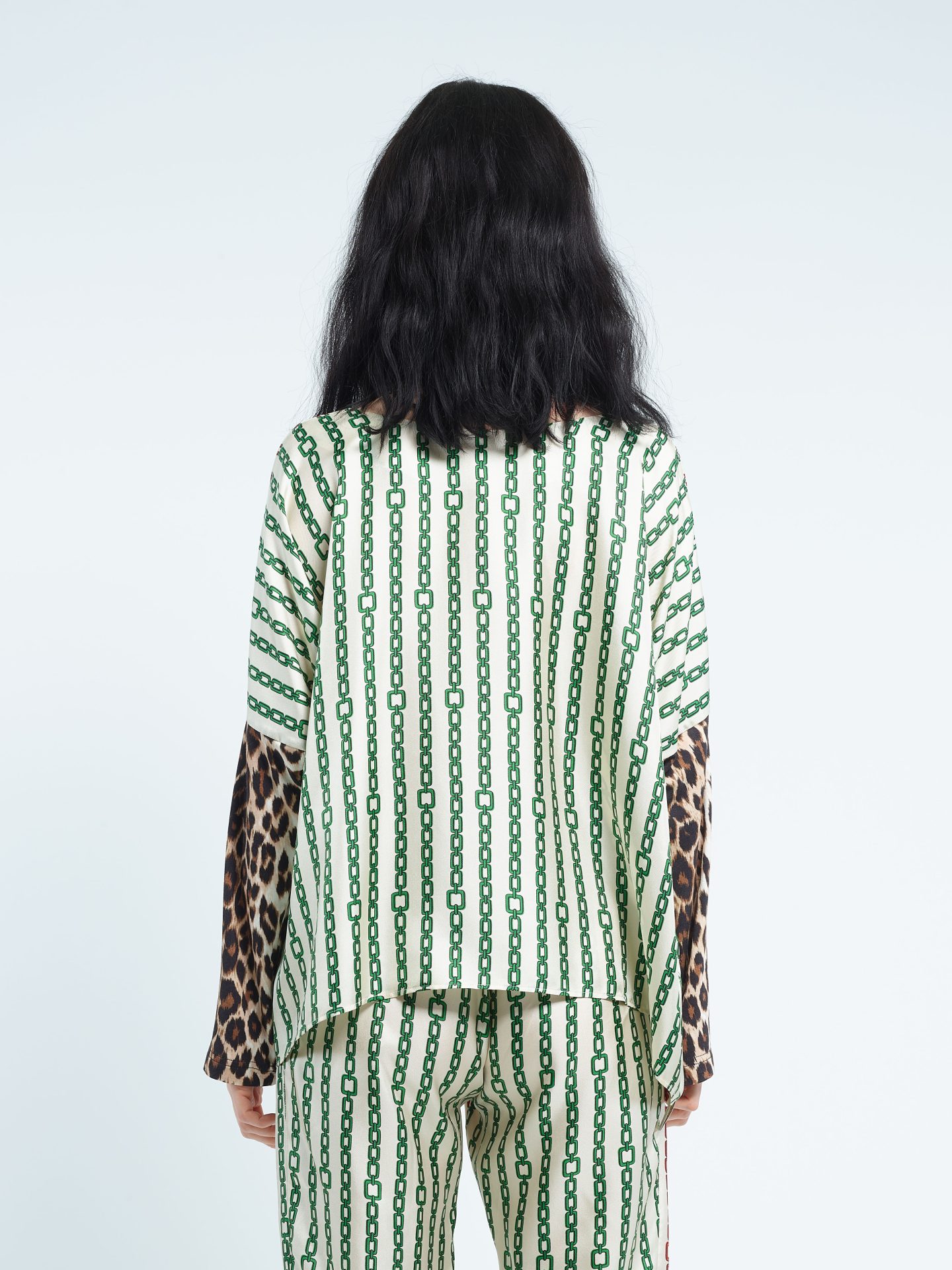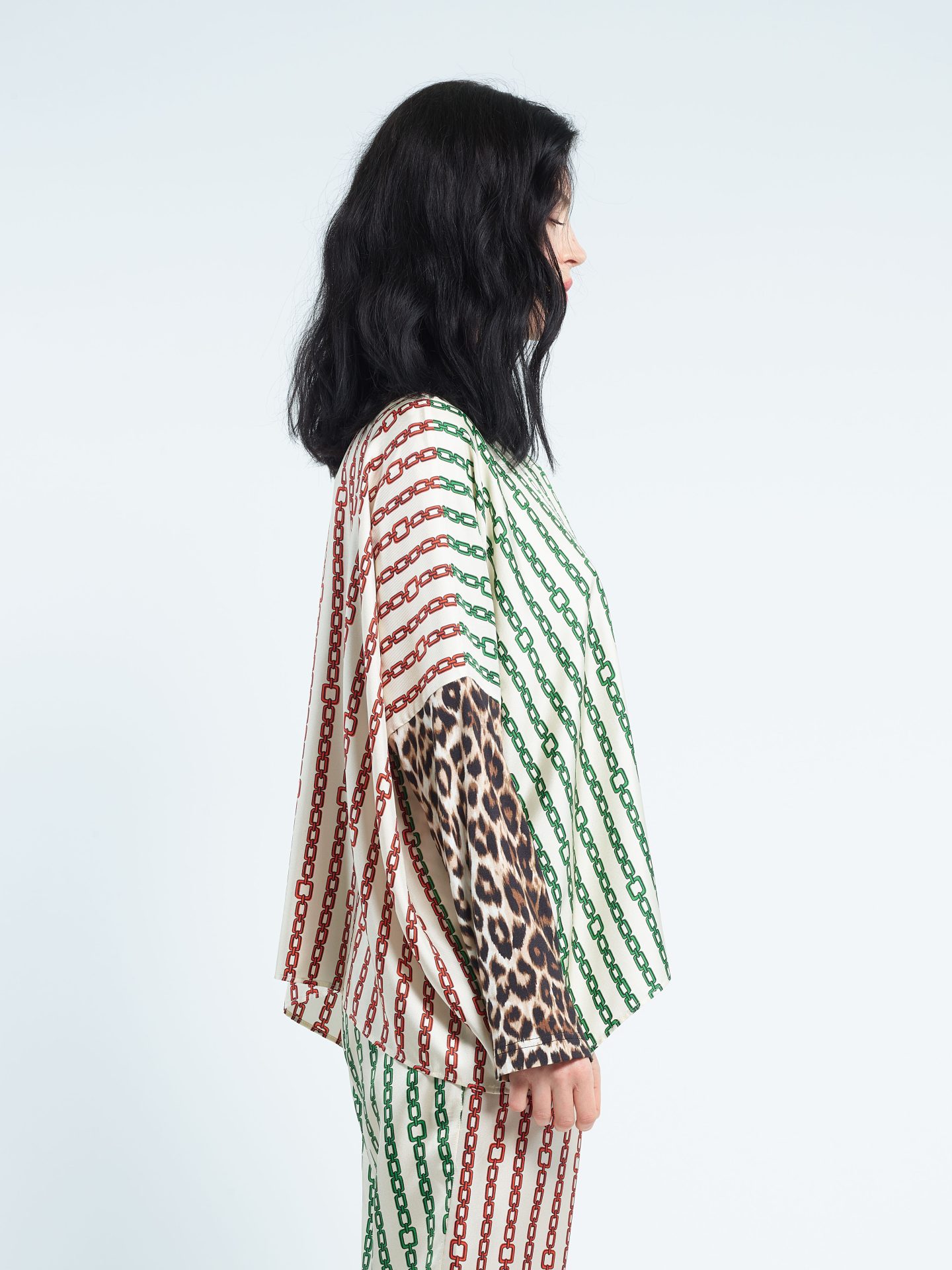 Loose biface round collar top in silk twill, viscose jersey long sleeves. Exclusive print “Chains” in two colors ; “Panther” on the sleeves. Can be worn on both sides.