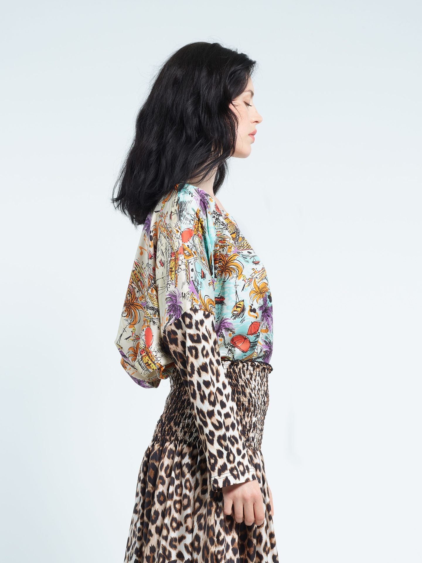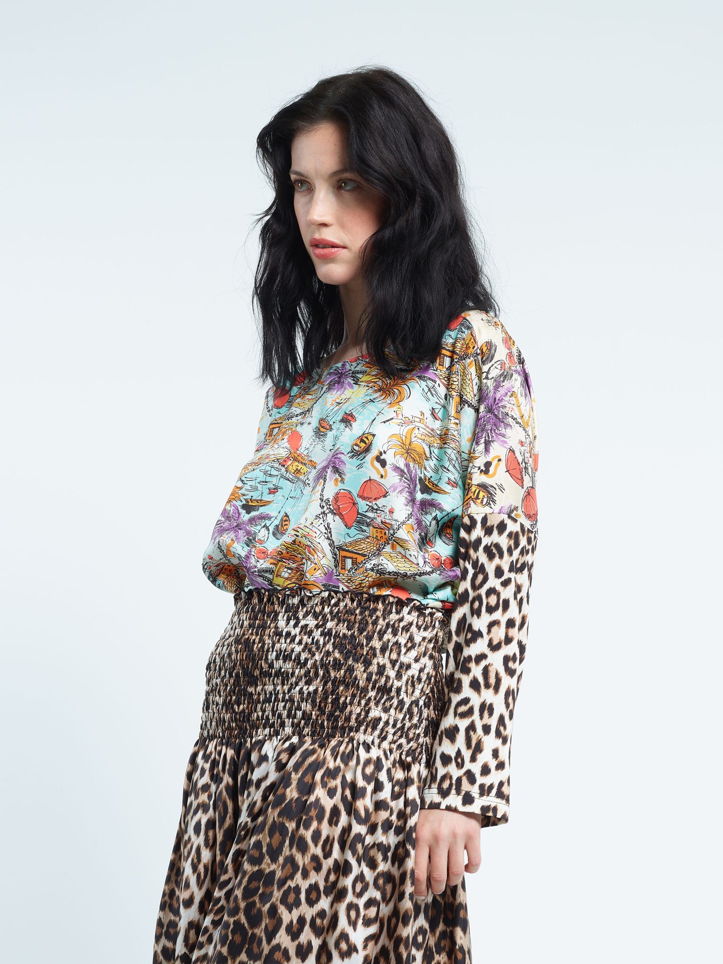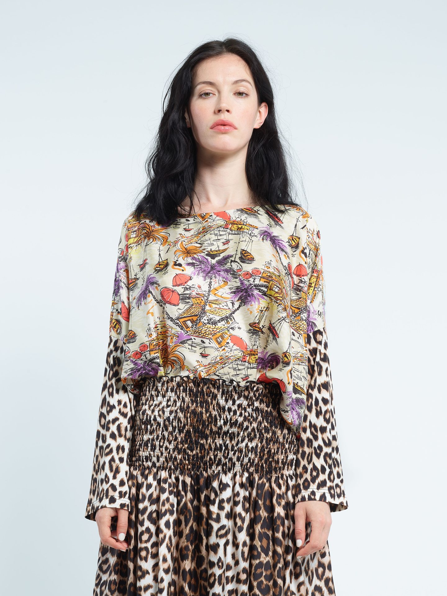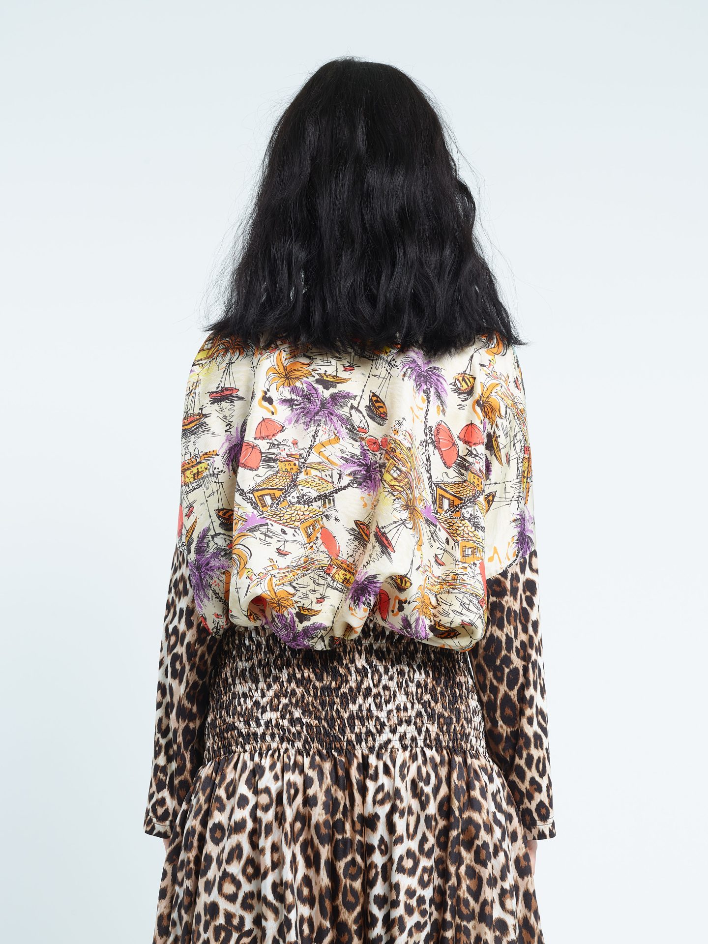 Loose biface round collar top in silk twill, viscose jersey long sleeves. Exclusive print “La Dolce Vita” and “Panther” print on the sleeves. Can be worn on both sides.