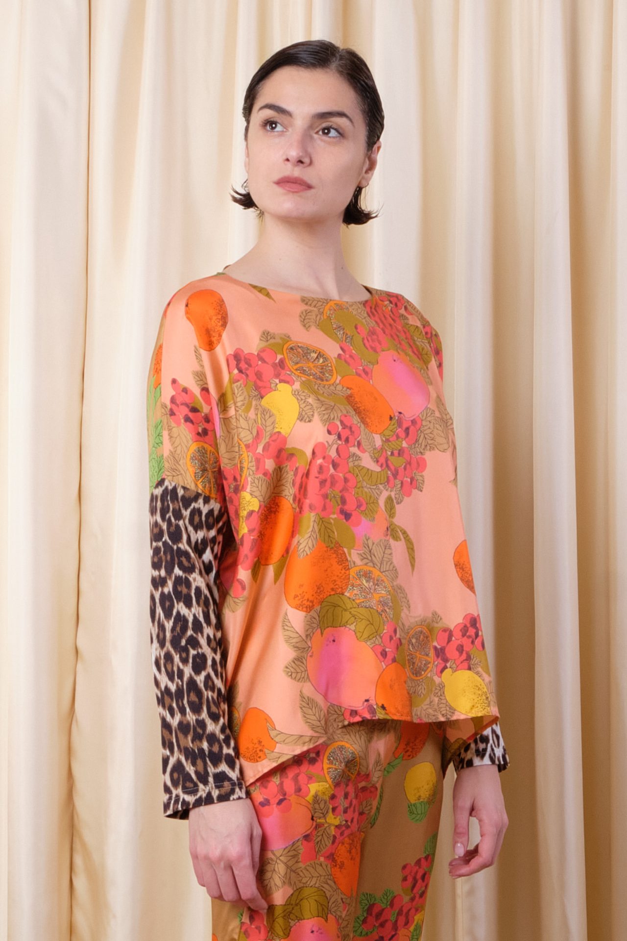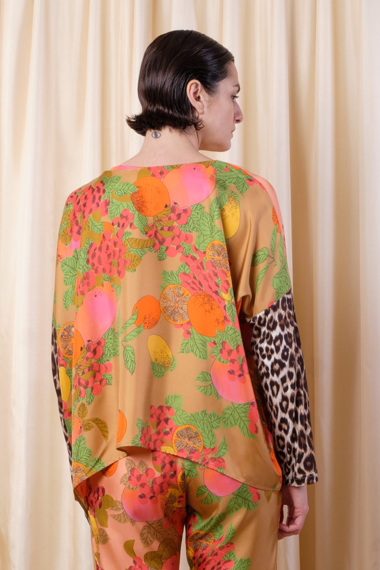 Loose biface round collar top in silk twill, viscose jersey long sleeves. Exclusive print “Fruits” in two colors ; “Panther” on the sleeves. Can be worn on both sides.