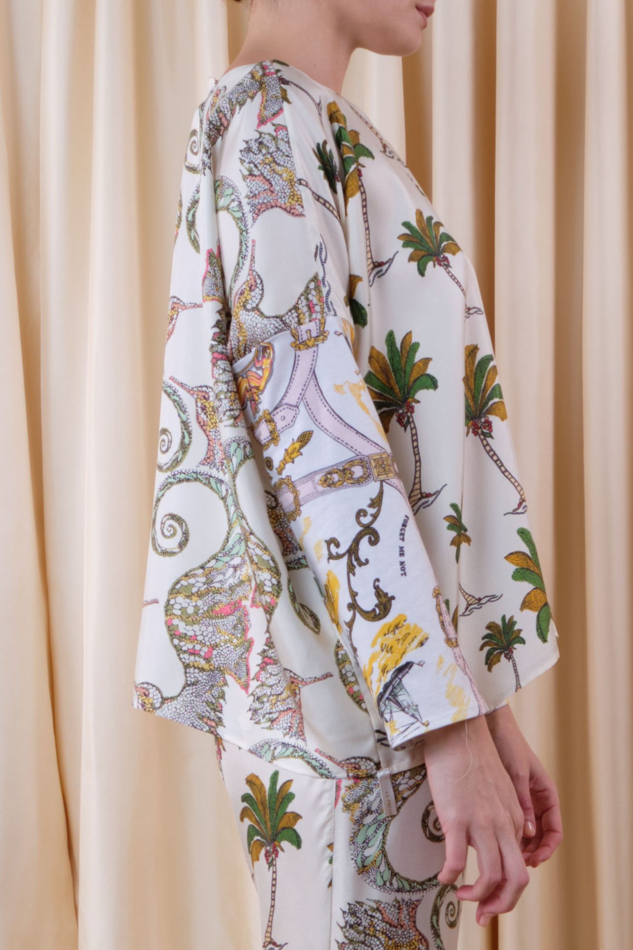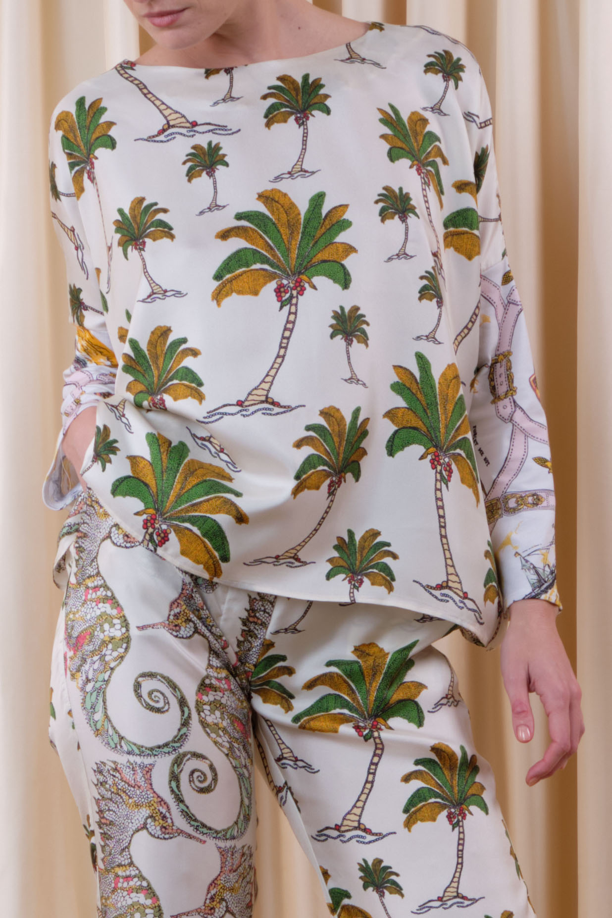 Loose biface round collar top in silk twill, viscose jersey long sleeves. Exclusive prints “Seahorses” and “Palm Trees” both based on Laurence Kiberlain’s drawings ; “Attachement” on the sleeves. Can be worn on both sides.