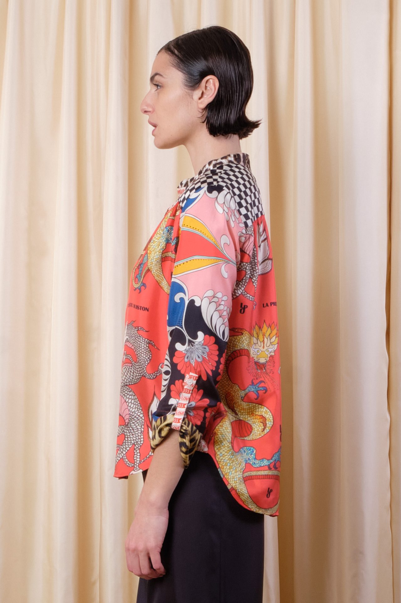 Long sleeved fully buttoned shirt with mao collar and yoke, in silk twill, and mother-of-pearl buttons. Exclusive prints “Dragons” based on Laurence Kiberlain’s drawings, “Checkerboard”, “Allegory”, “Kiss Love” and “Panther”.