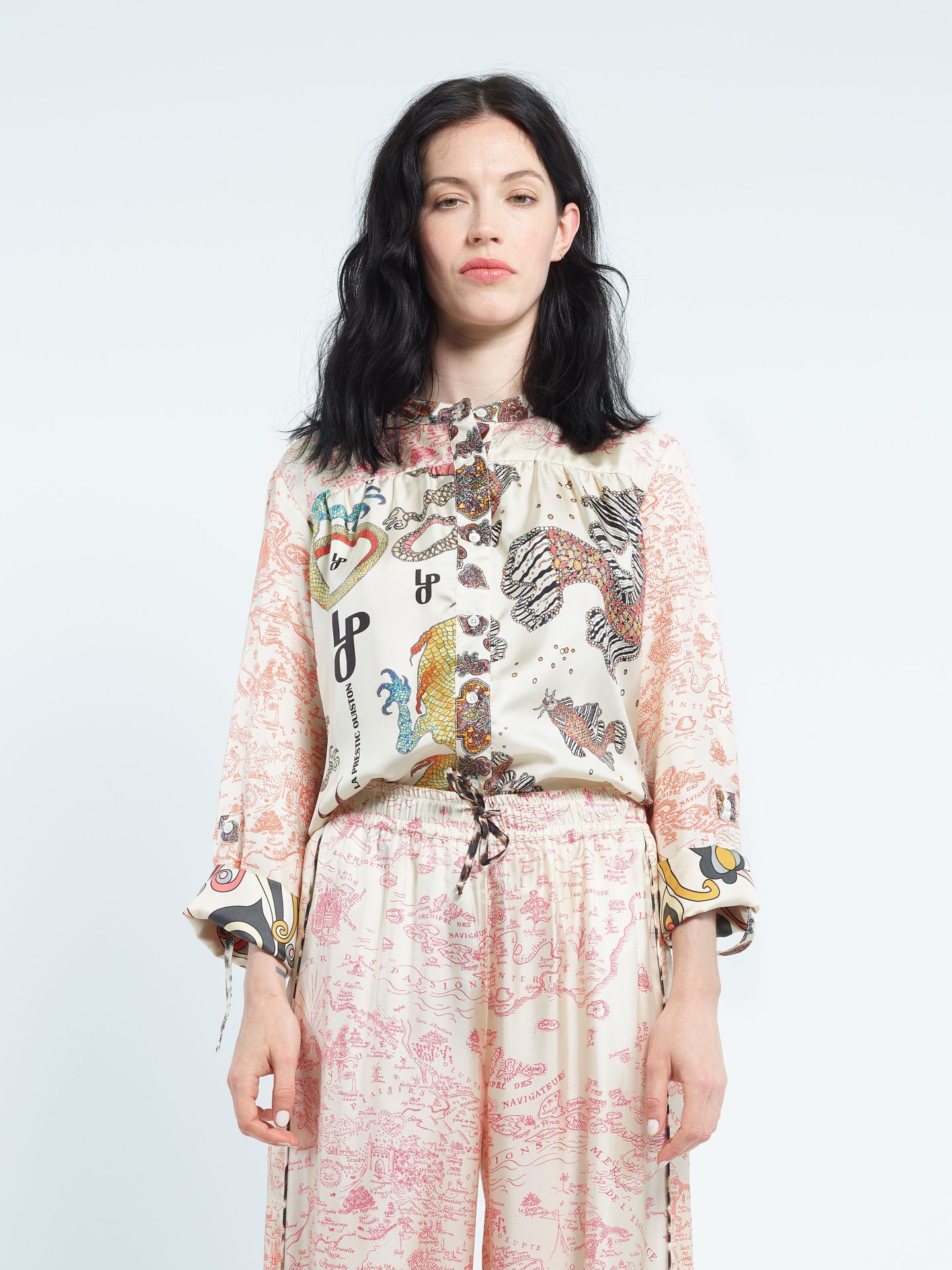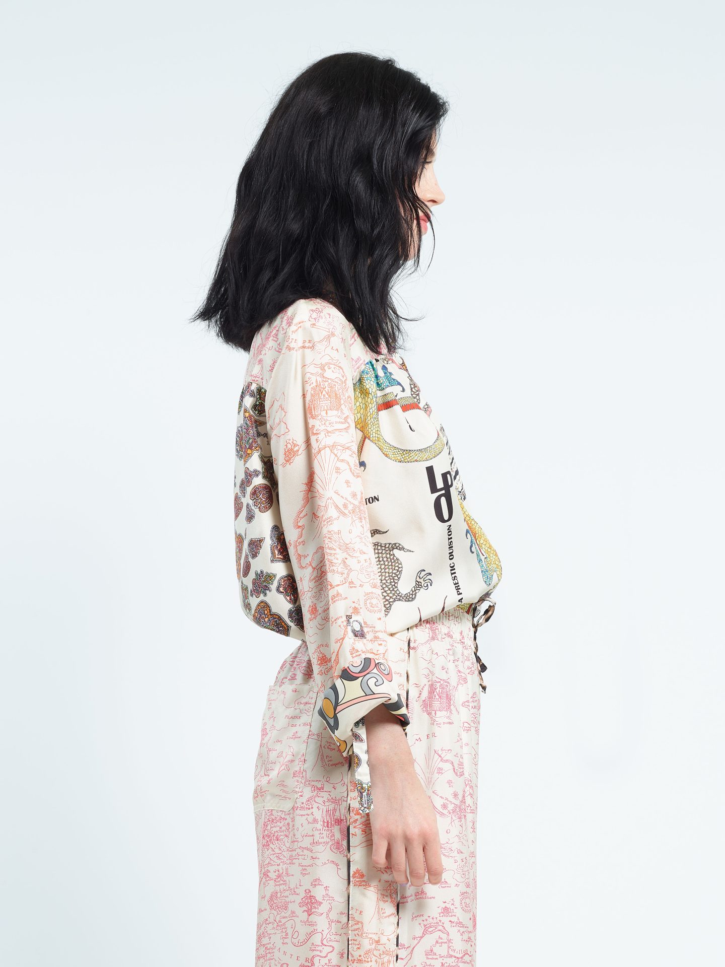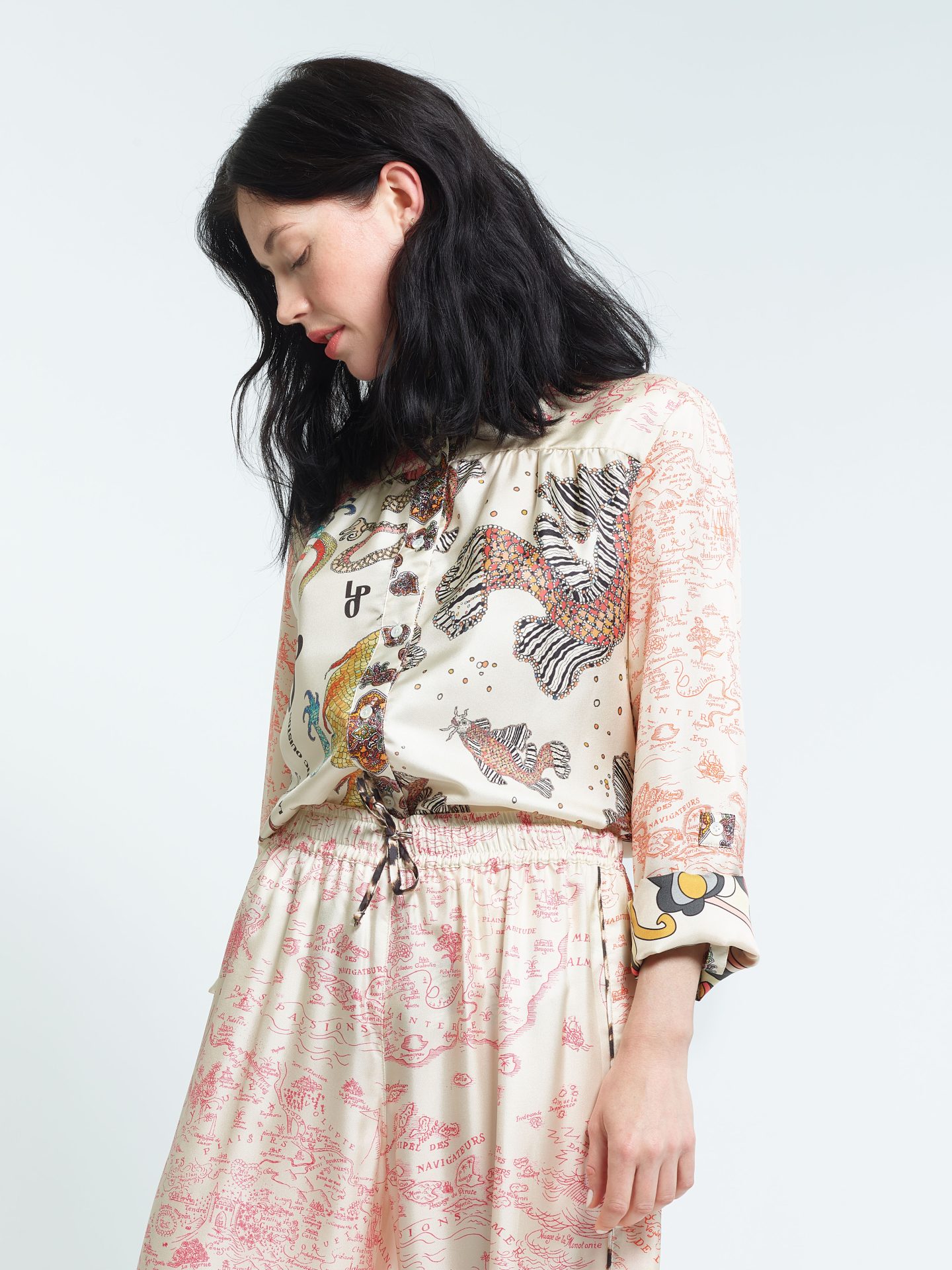 Long sleeved fully buttoned shirt with mao collar and yoke, mainly in silk twill. Exclusive prints “Dragons” and “Fishes” based on Laurence Kiberlain’s drawings, and “Map of the Tender”, “Chic” and “Arabesques”.