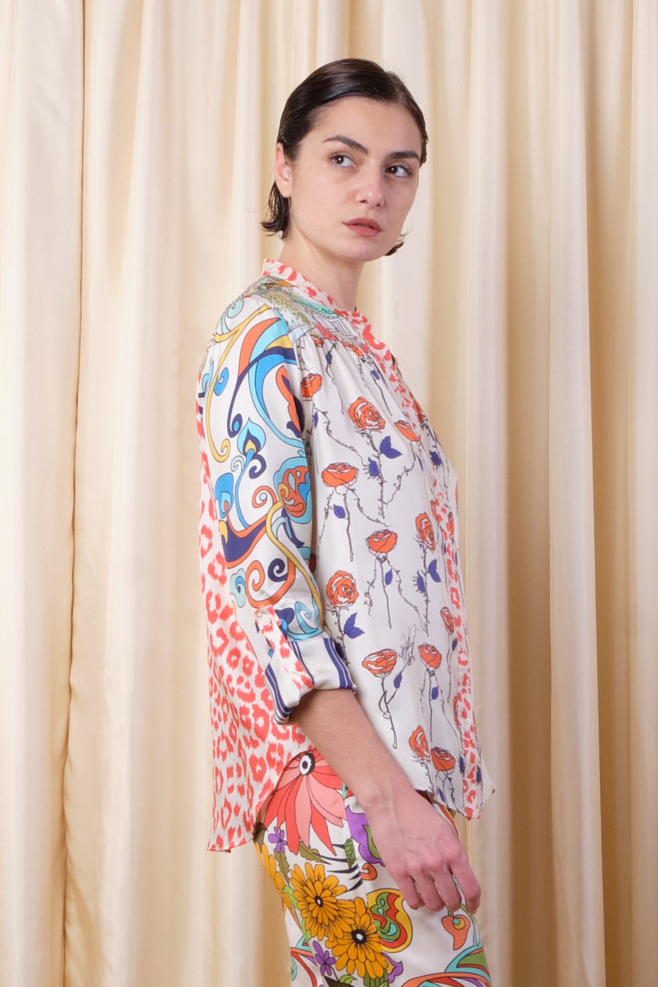Long sleeved fully buttoned shirt with mao collar and yoke, mainly in silk twill. Exclusive prints “Elegance” and “Paris” based on Laurence Kiberlain’s drawings, and “Arabesques”, and “Panther”.