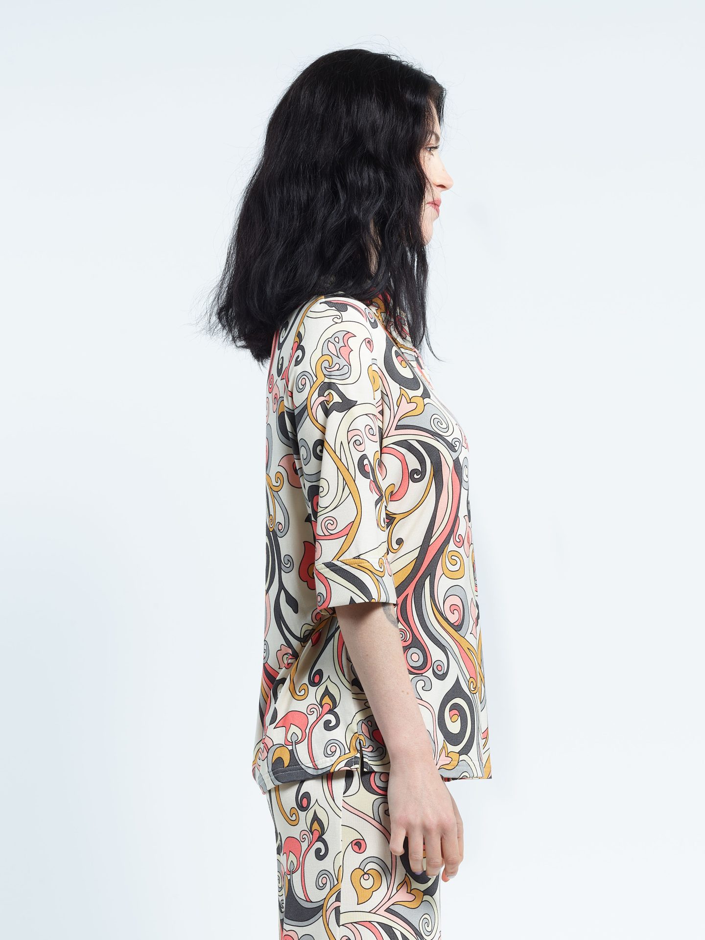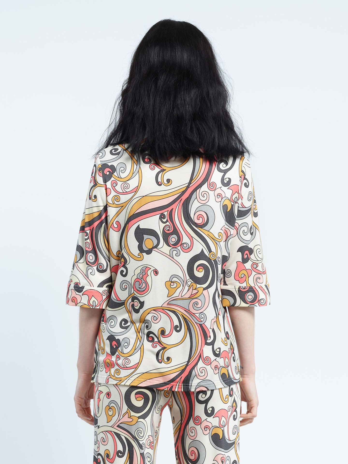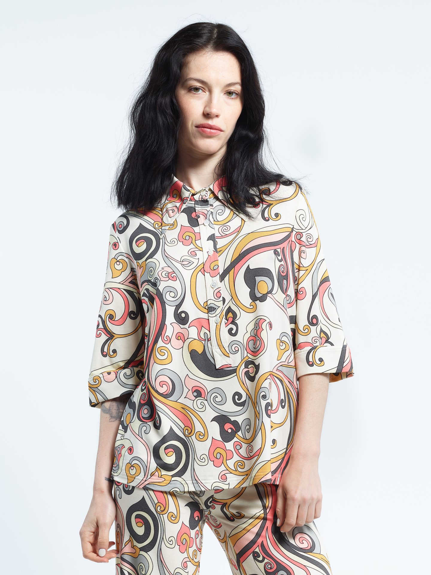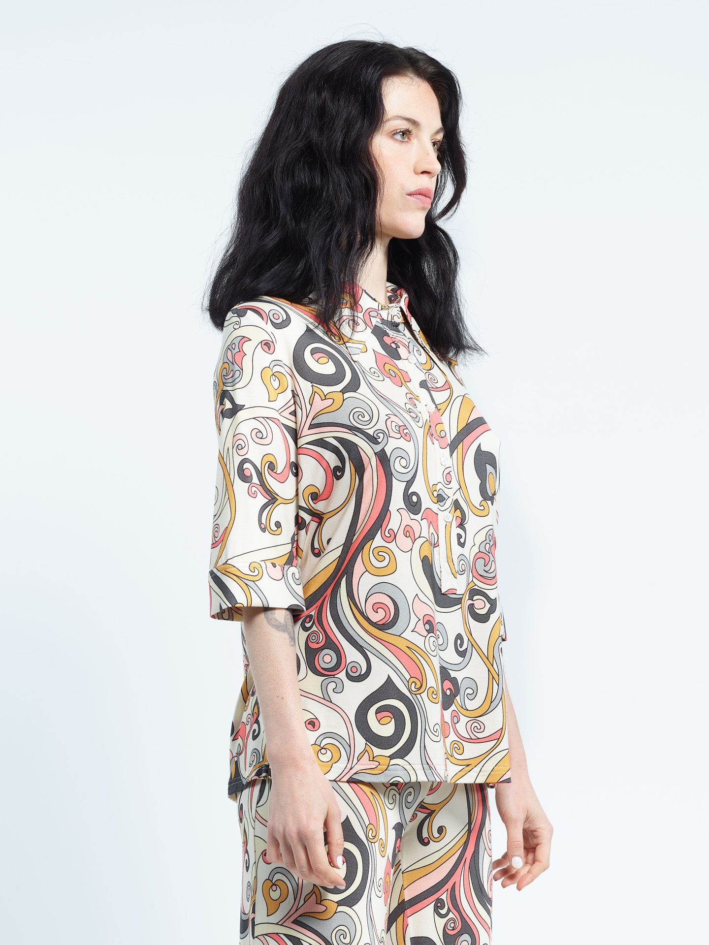 Polo shirt with pointed collar, short sleeves, five mother-of-pearl buttons, in viscose jersey. Exclusive print “Arabesque”.