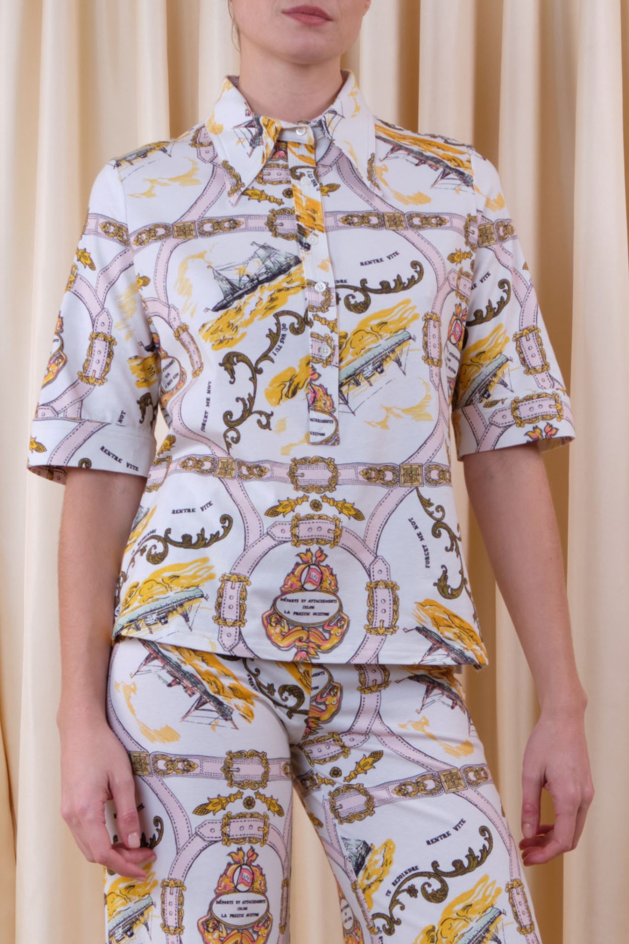 Polo shirt with pointed collar, short sleeves, five mother-of-pearl buttons, in viscose jersey. Exclusive print “Attachement”.