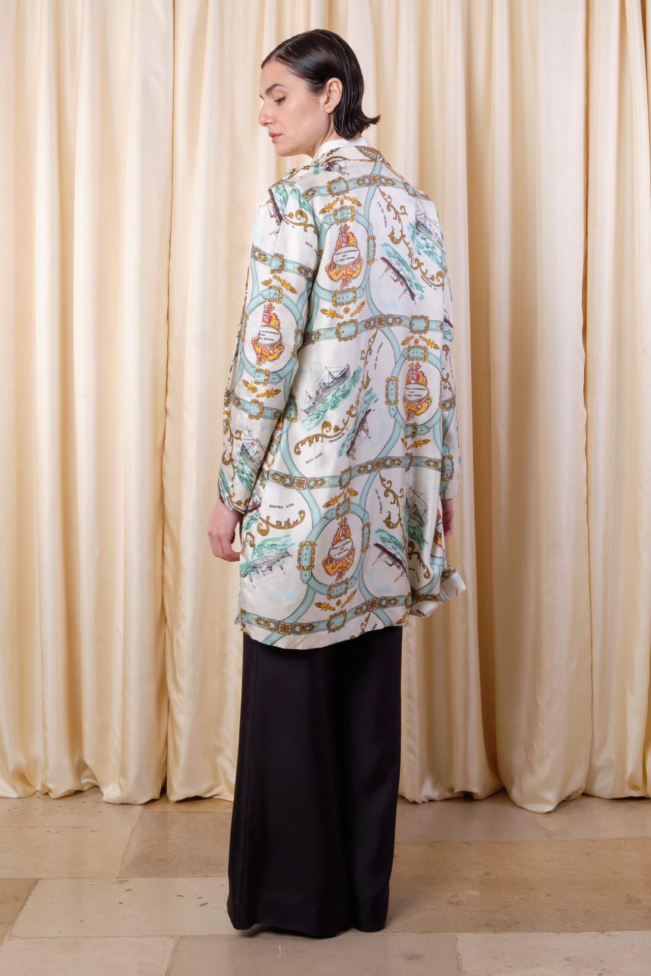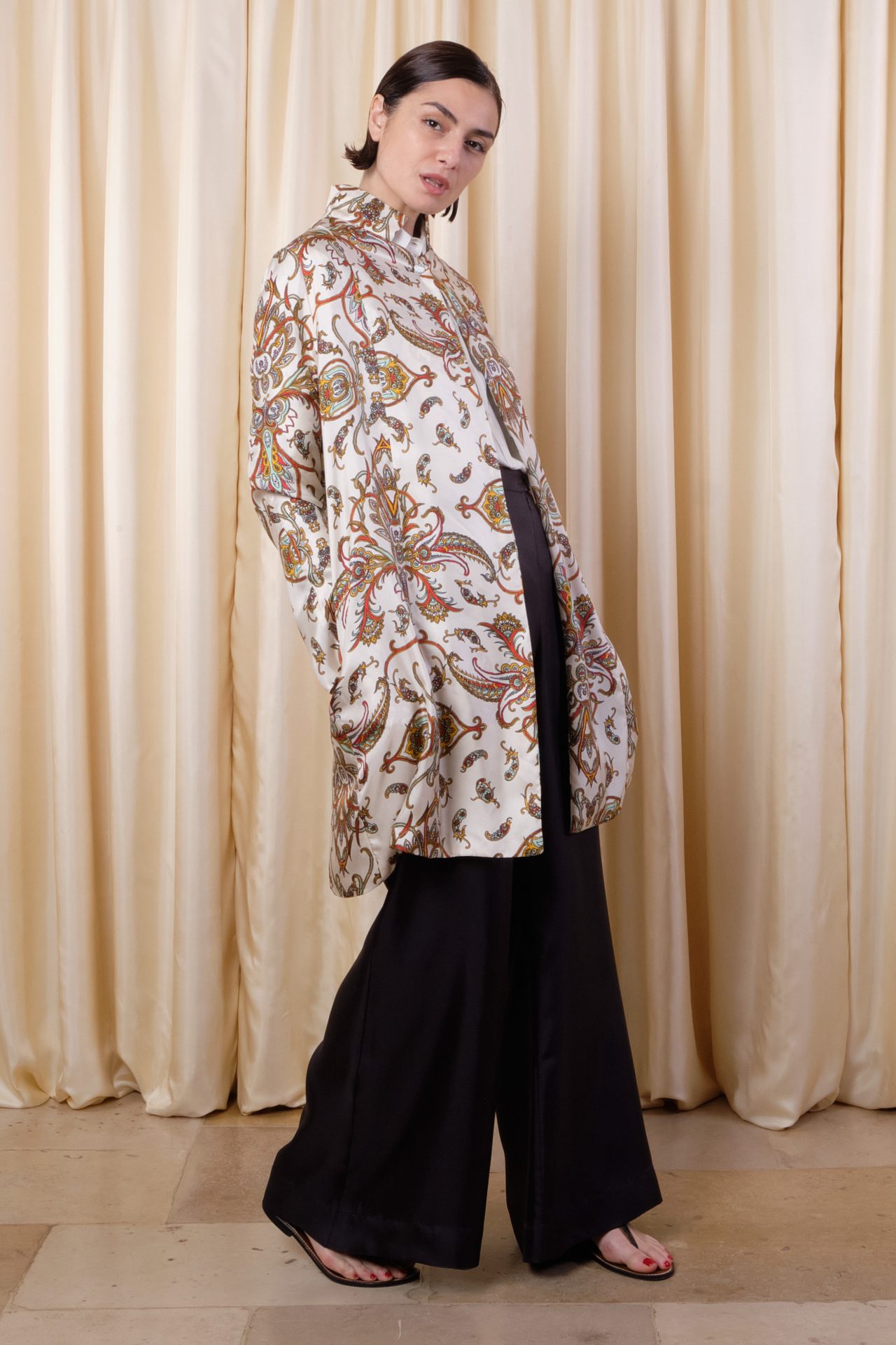 Reversible silk twill trench coat with pockets, one button on the collar. Exclusive prints “Calcutta” and “Attachement”.