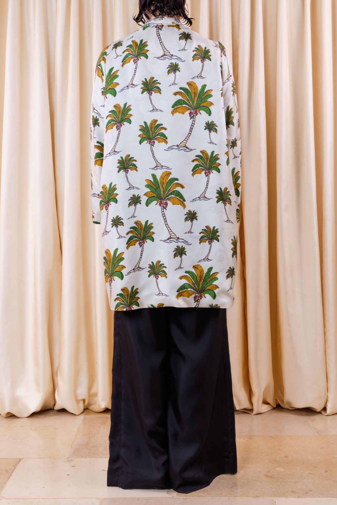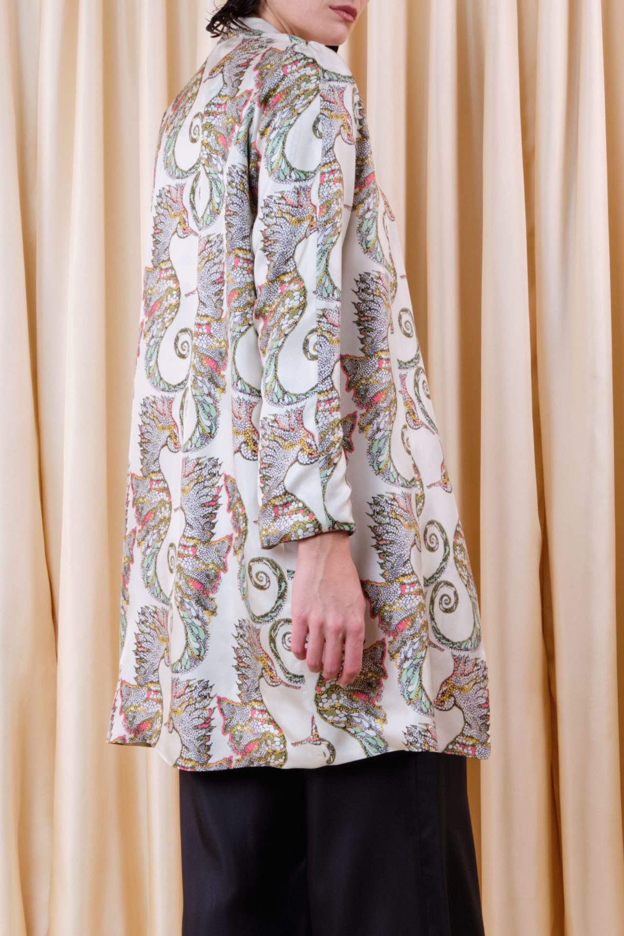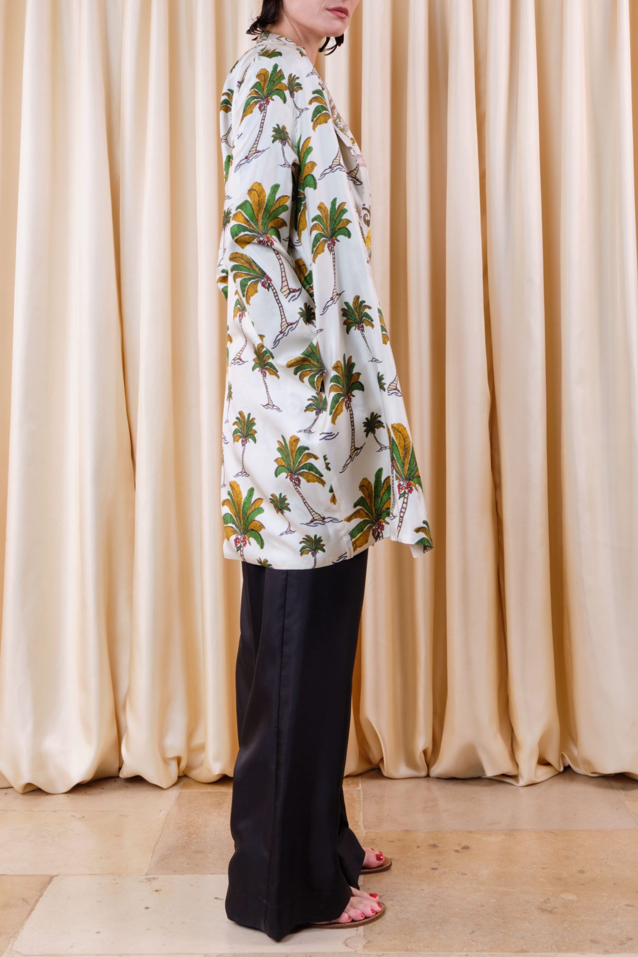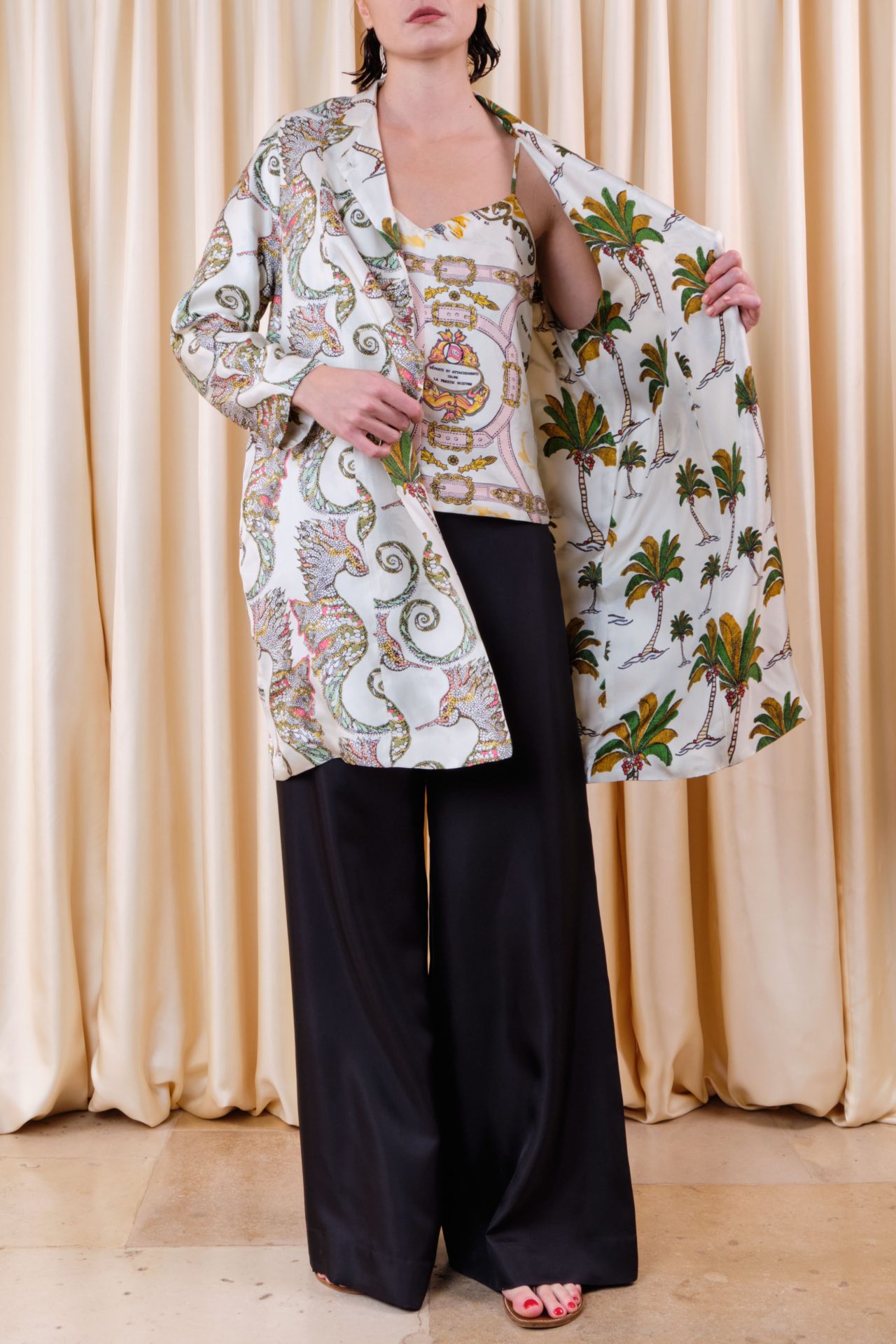 Reversible silk twill trench coat with pockets, one button on the collar. Exclusive prints “Seahorses” and “Palm Trees” both based on Laurence Kiberlain’s drawings.