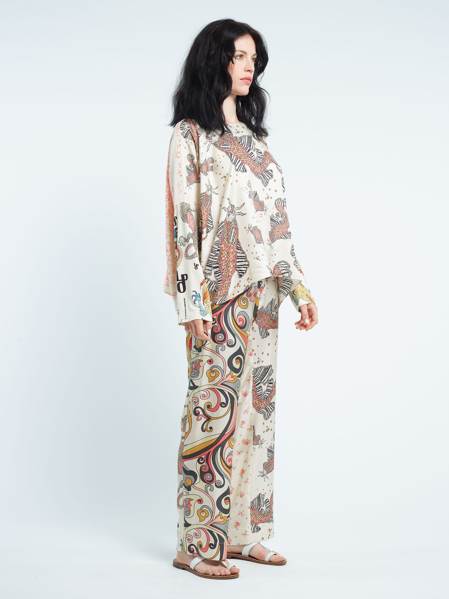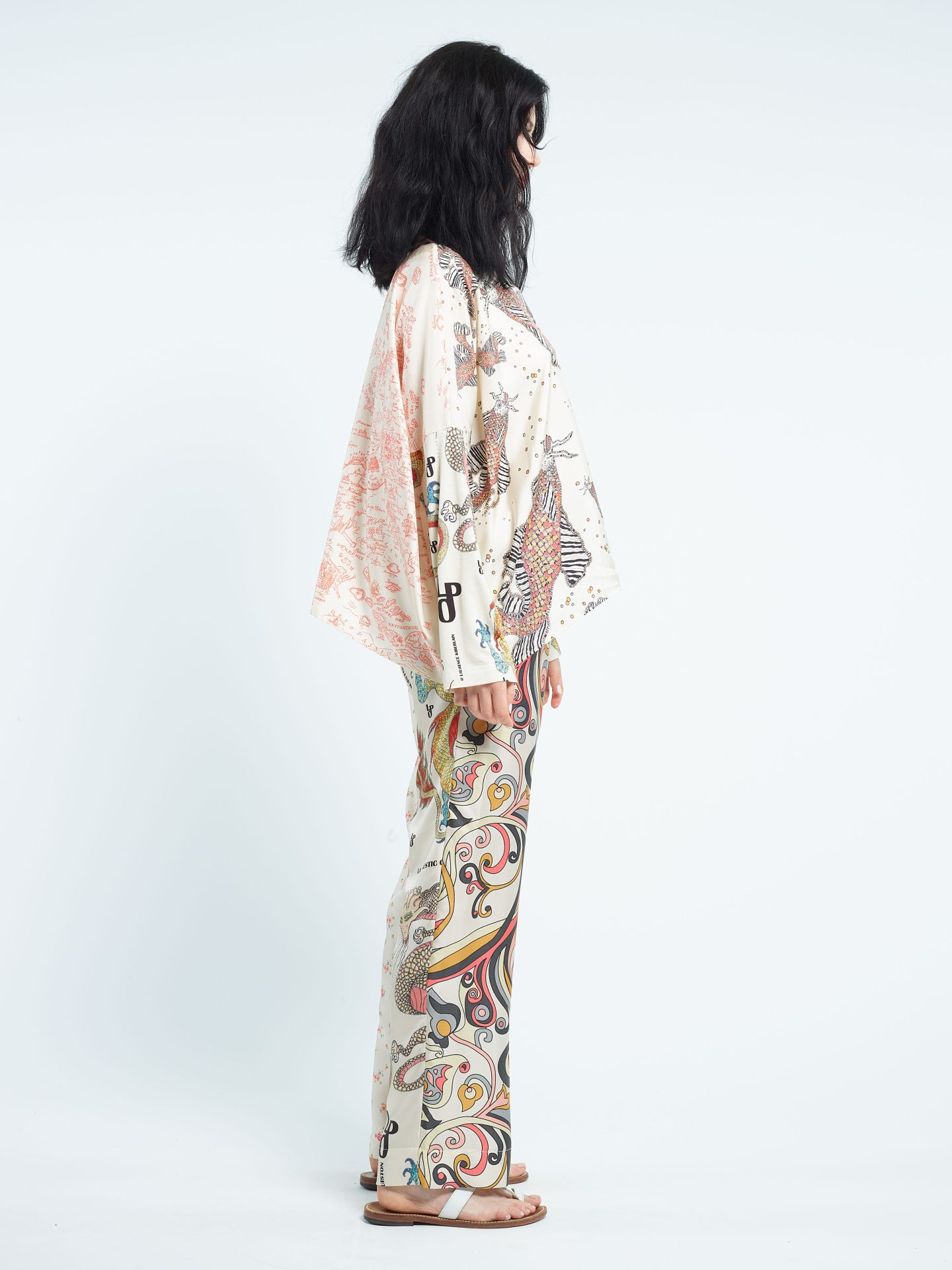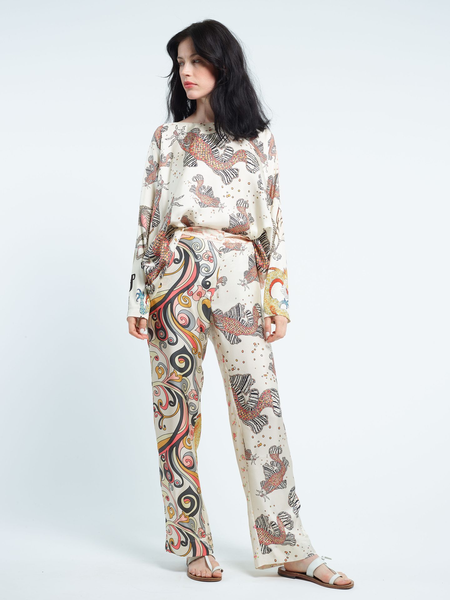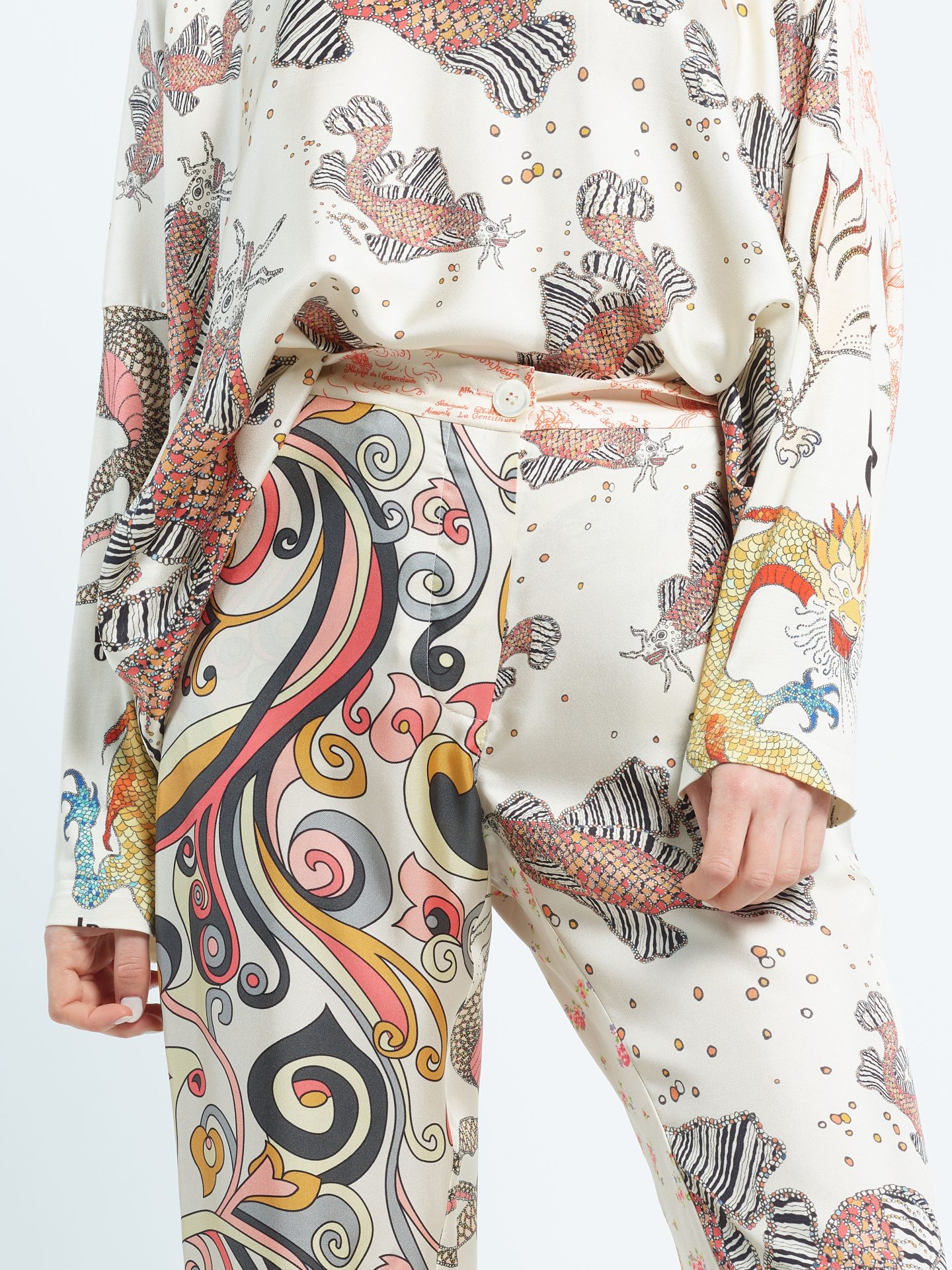 Natural-rise straight pants with pockets and elastic belt, adjustable with inside buttons, fully in silk twill. Exclusive prints “Dragons” and “Fishes” based on Laurence Kiberlain’s drawings, “Arabesques” “Fleurette” and “Map of the Tender”.