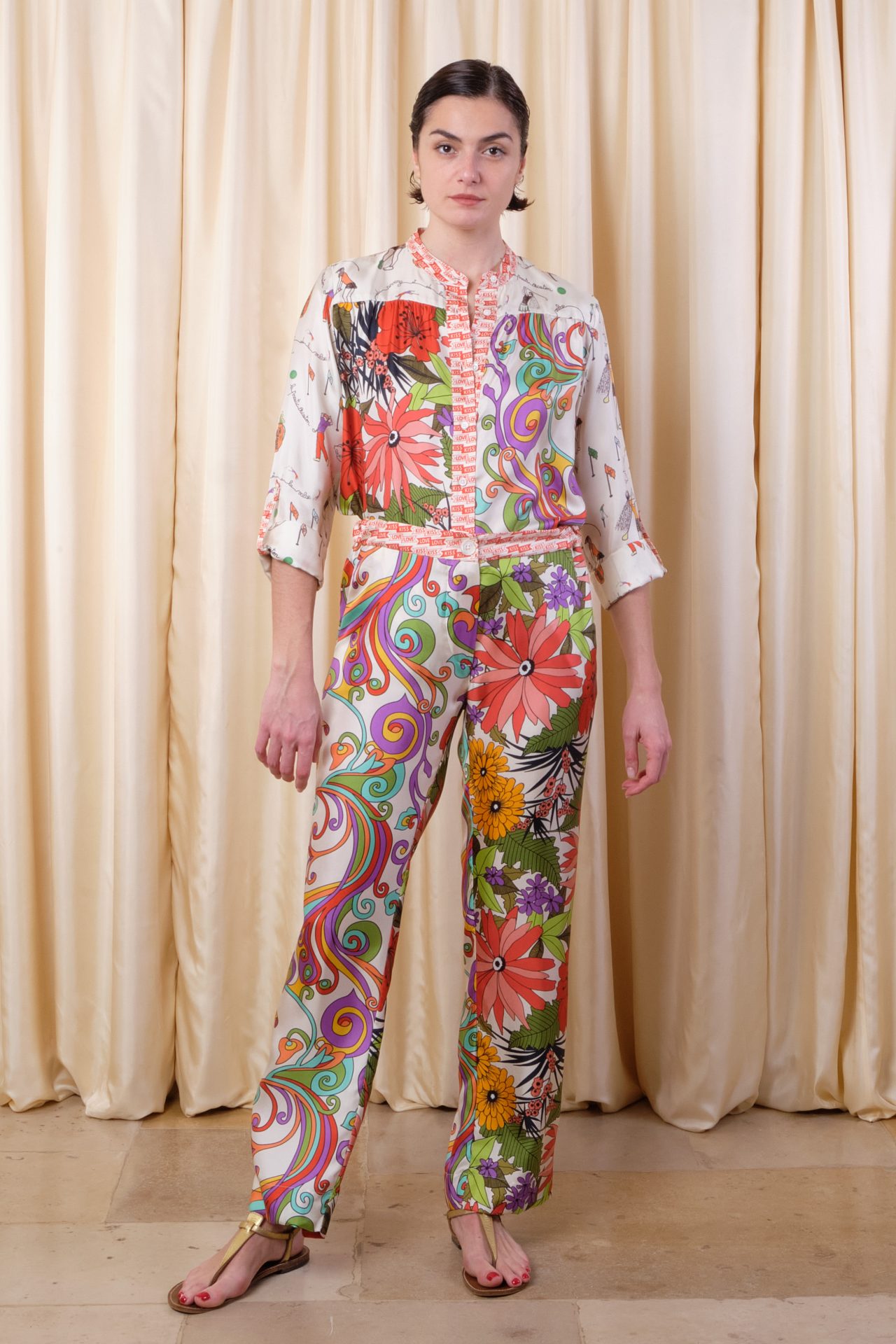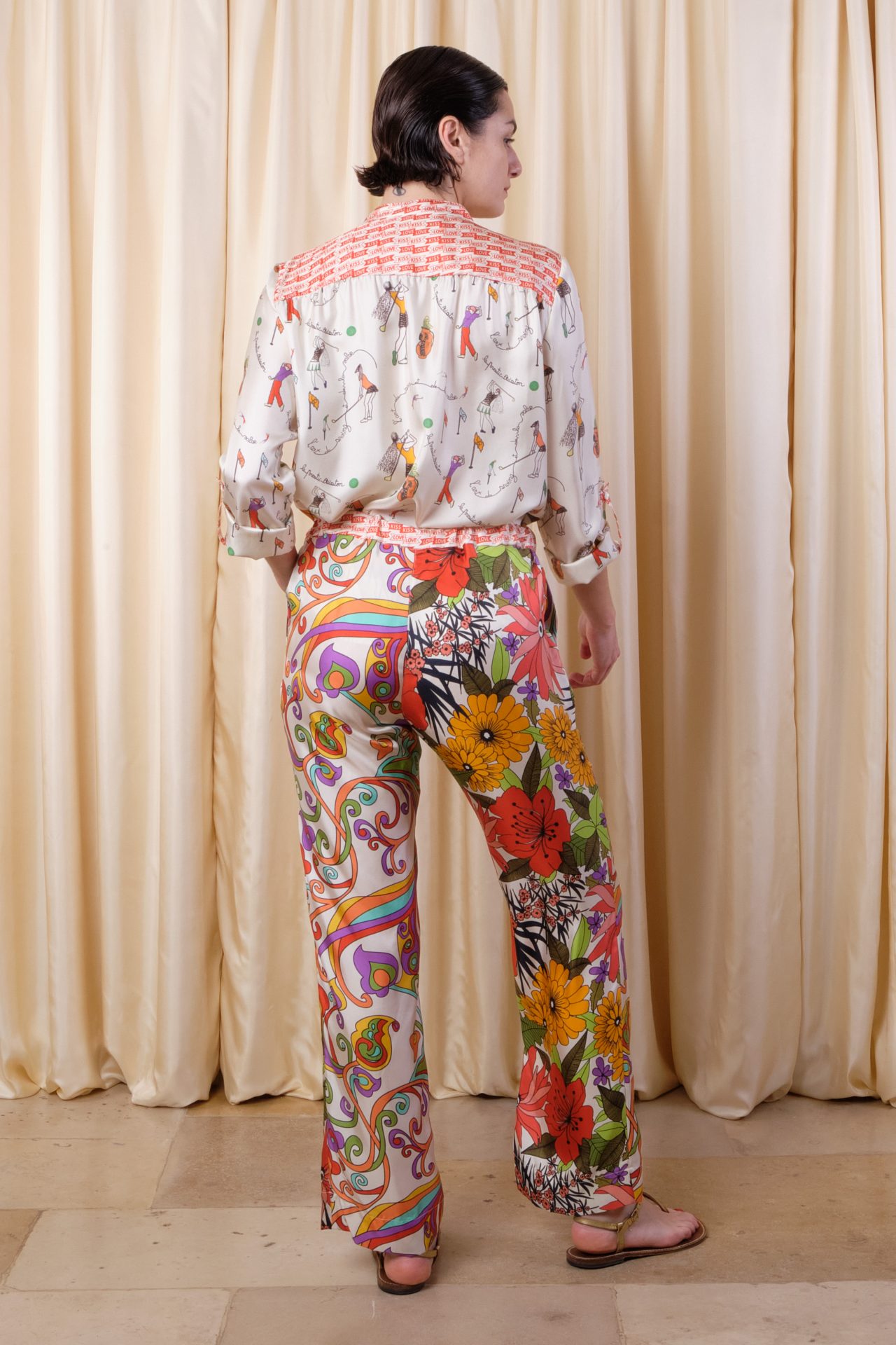 Natural-rise straight pants with pockets and elastic belt, adjustable with inside buttons, fully in silk twill. Exclusive print “Arabesques”, “Hibiscus”, and “Kiss Love”.
