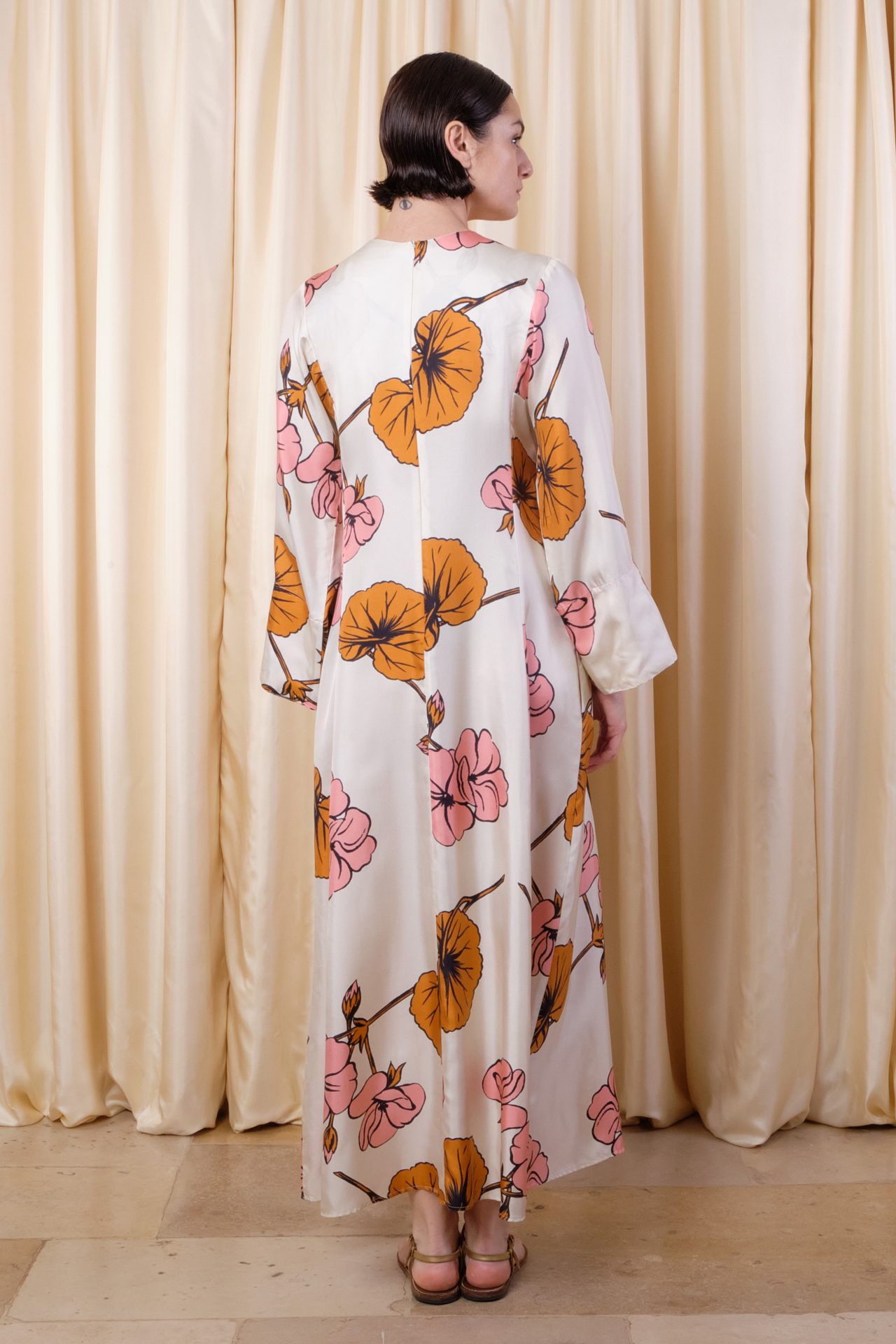 Long, loose dress, flared sleeves, Tunisian collar, fully in silk twill. Exclusive print “Big Flowers”.