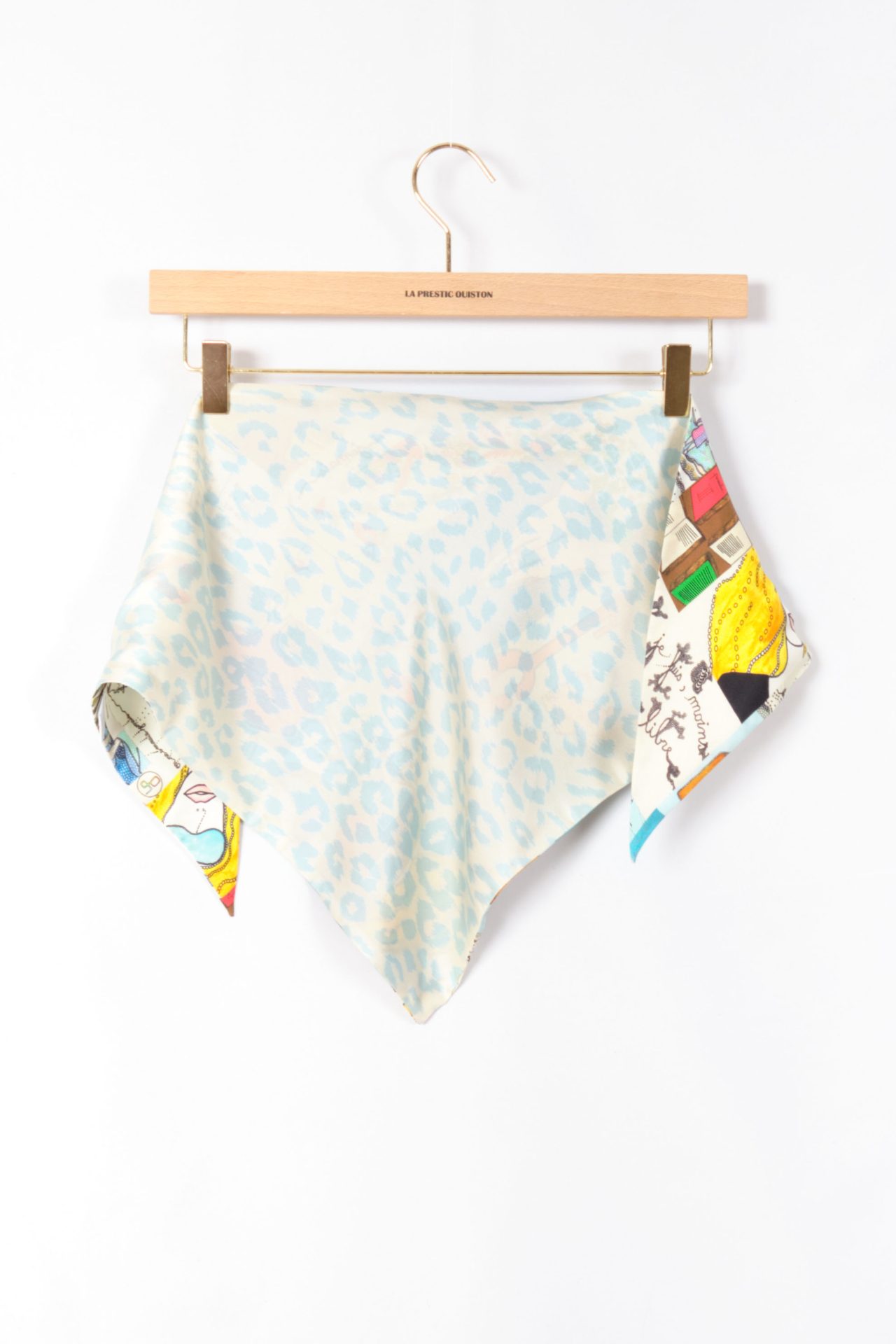 Mini triangle biface scarf in silk twill, exclusive prints “Loki Patchwork” based on Laurence Kiberlain’s drawings and “Panther”.