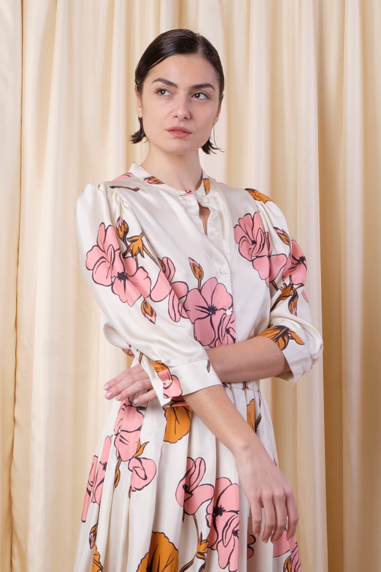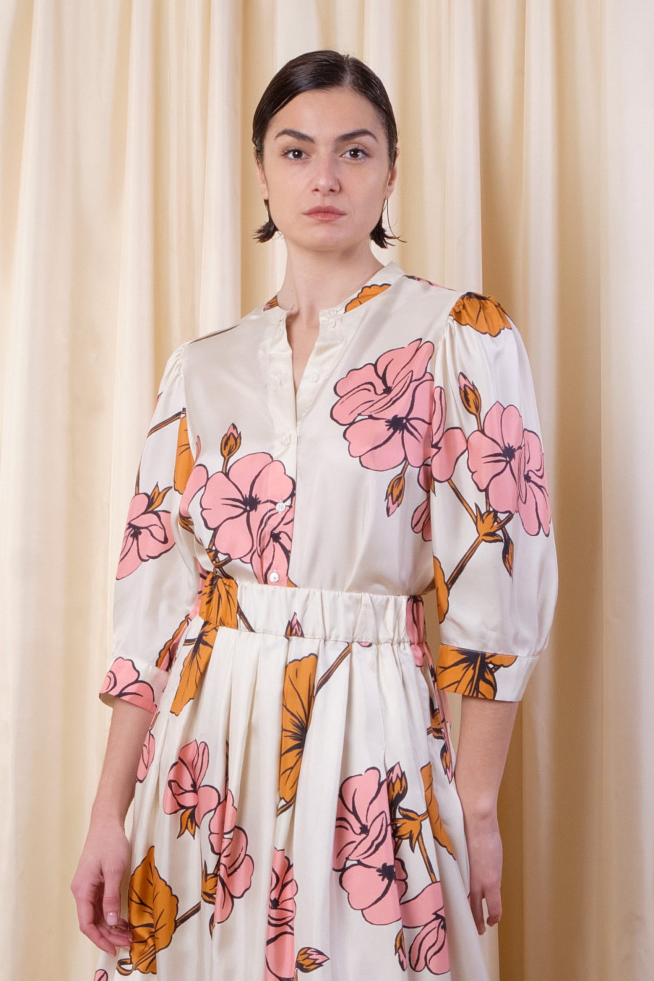 Shirt in silk twill, fully buttoned on the front, balloon three-quarter sleeves, rising collar split at the back of the neck, gathers on the back, mother-of-pearl buttons. Exclusive print “Big Flowers”.