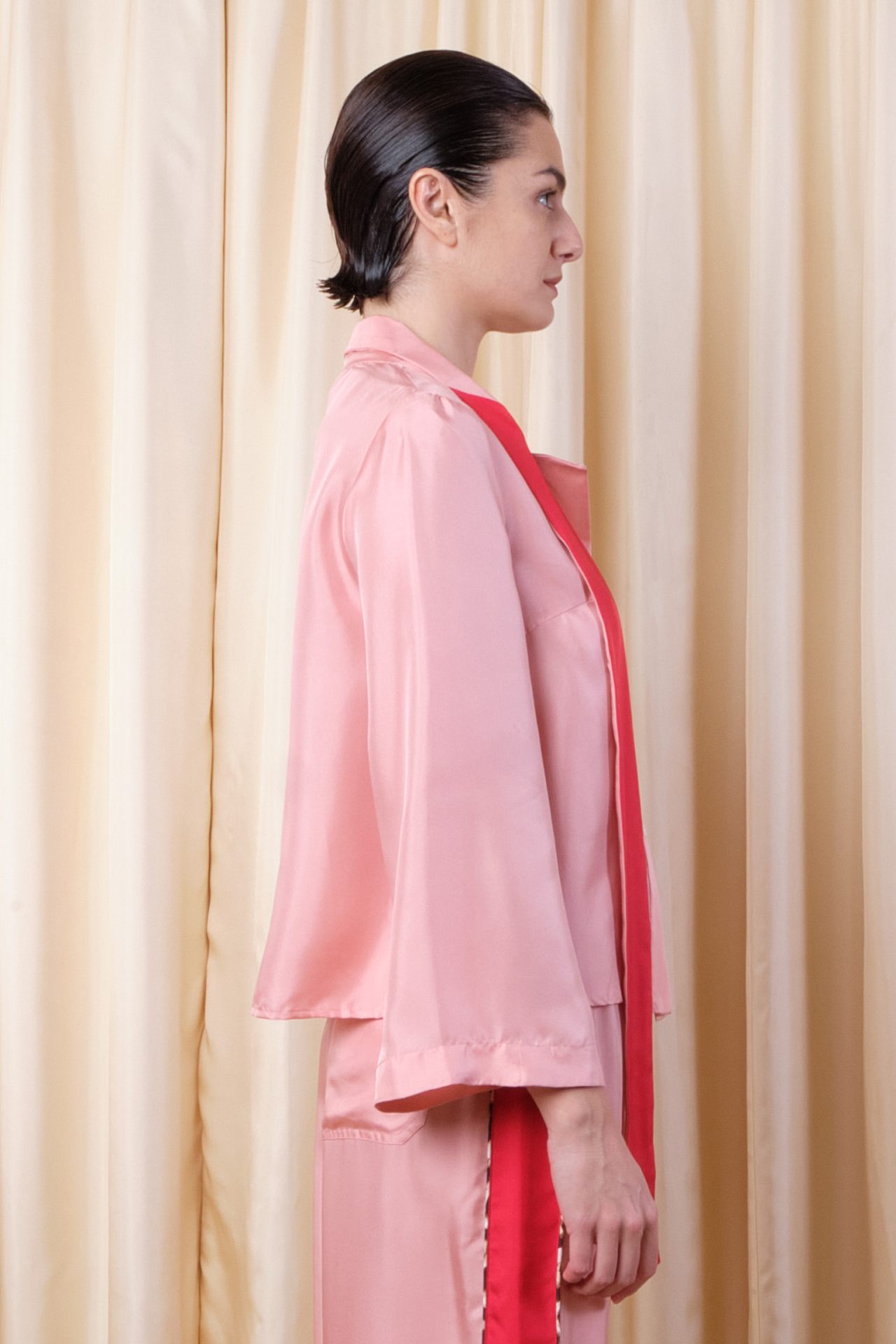 Long-sleeved shirt in silk twill with ascot collar, fully buttoned, mother-of-pearl buttons.