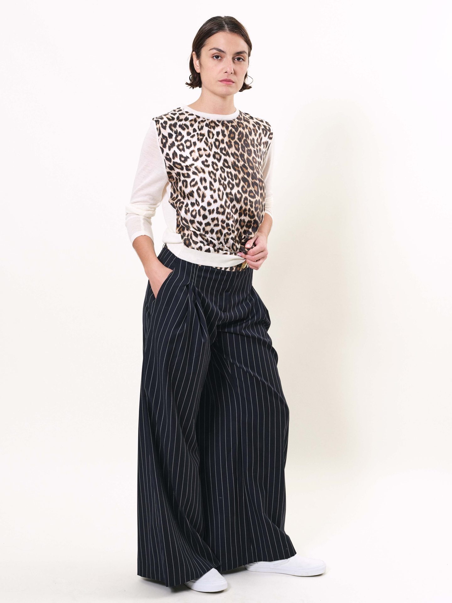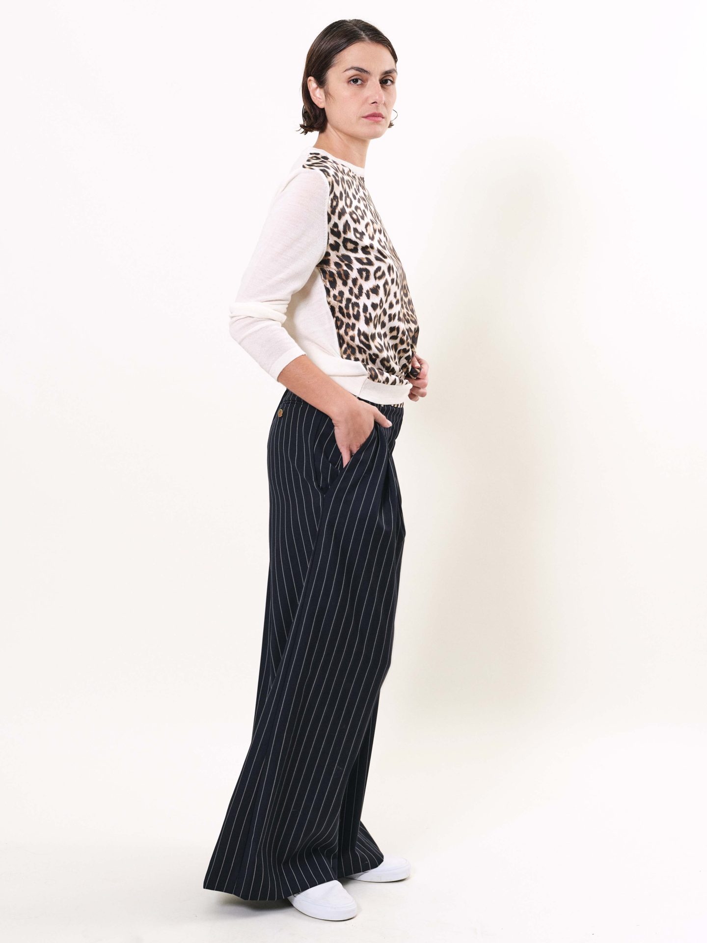Long and wide pants with italian pockets and two darts at the front, belt covered of silk twill. Exclusive print “Panther”.