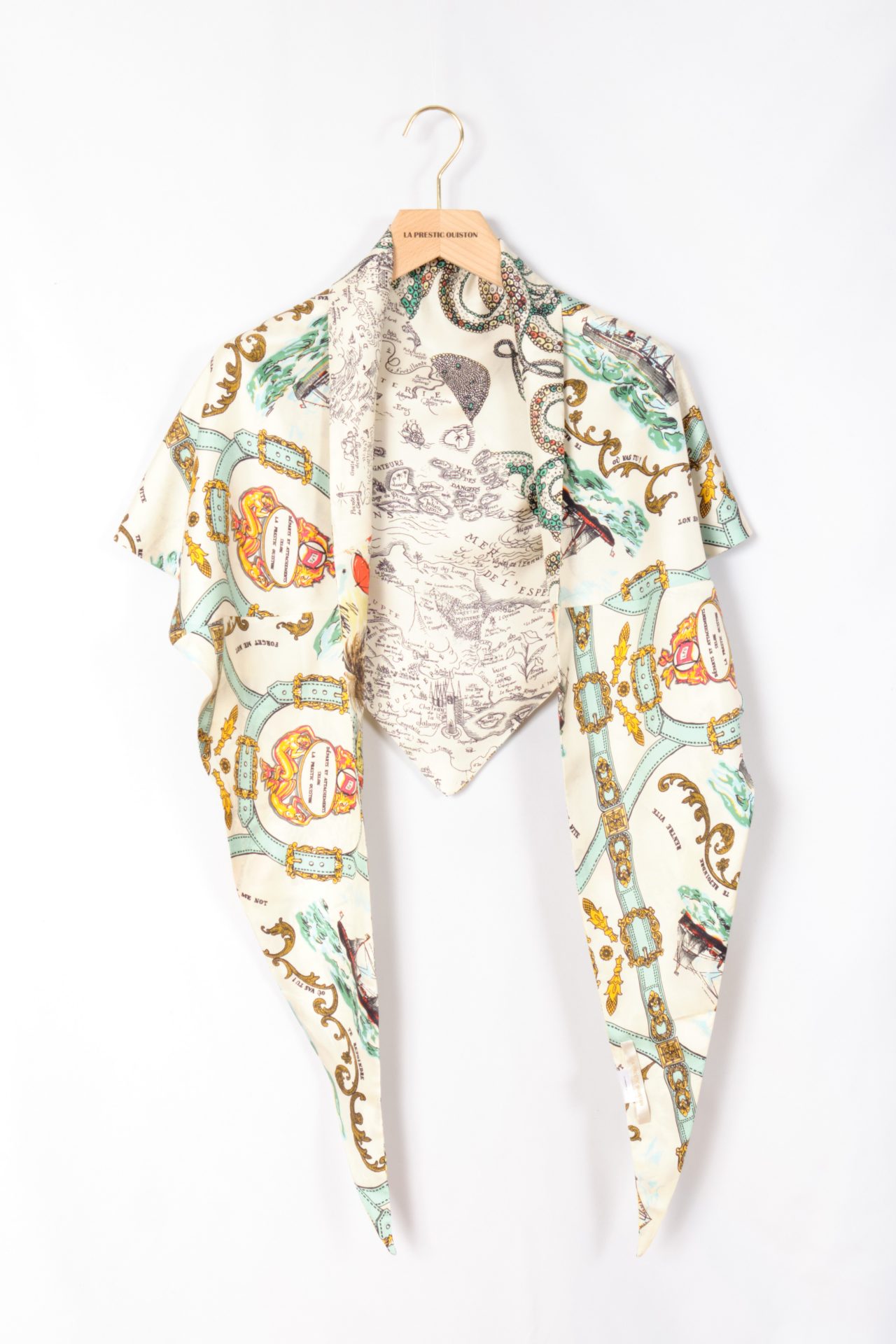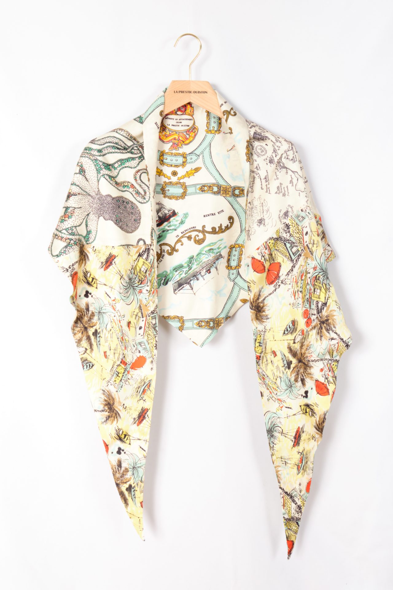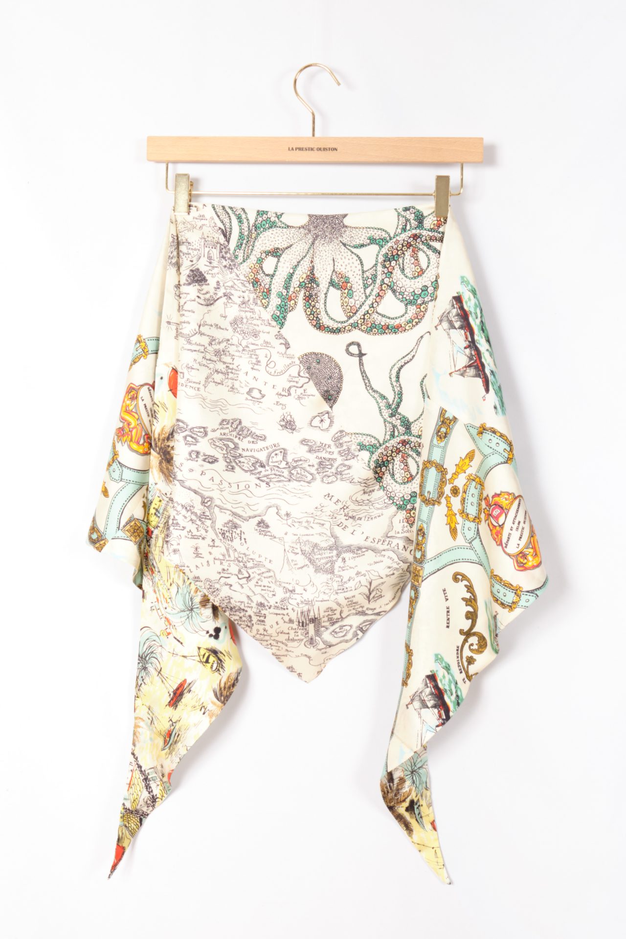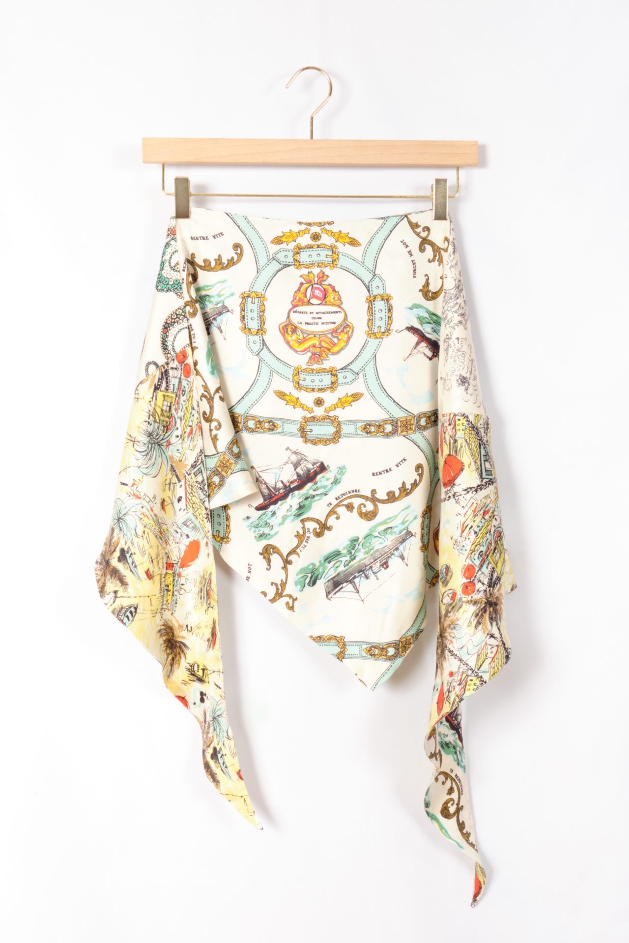Long triangle scarf in silk twill, patchworked with seven exclusive prints.
