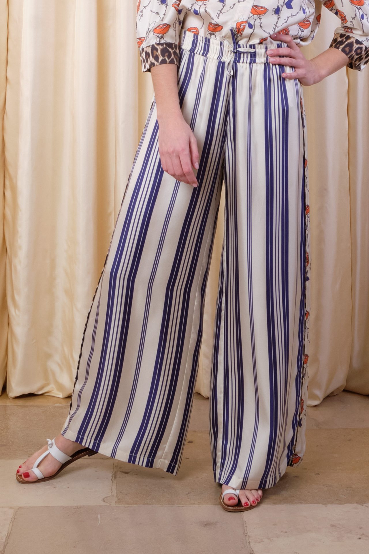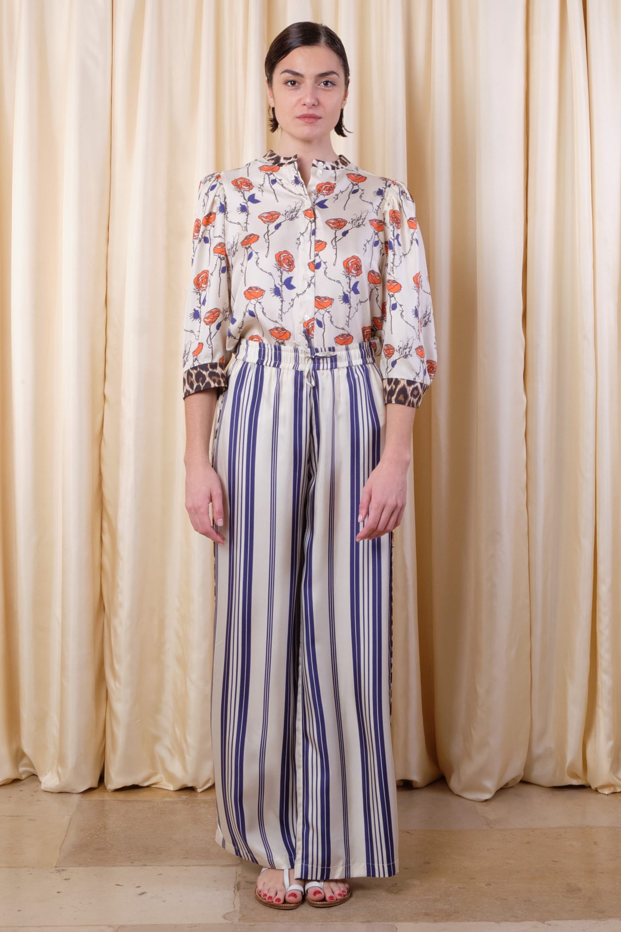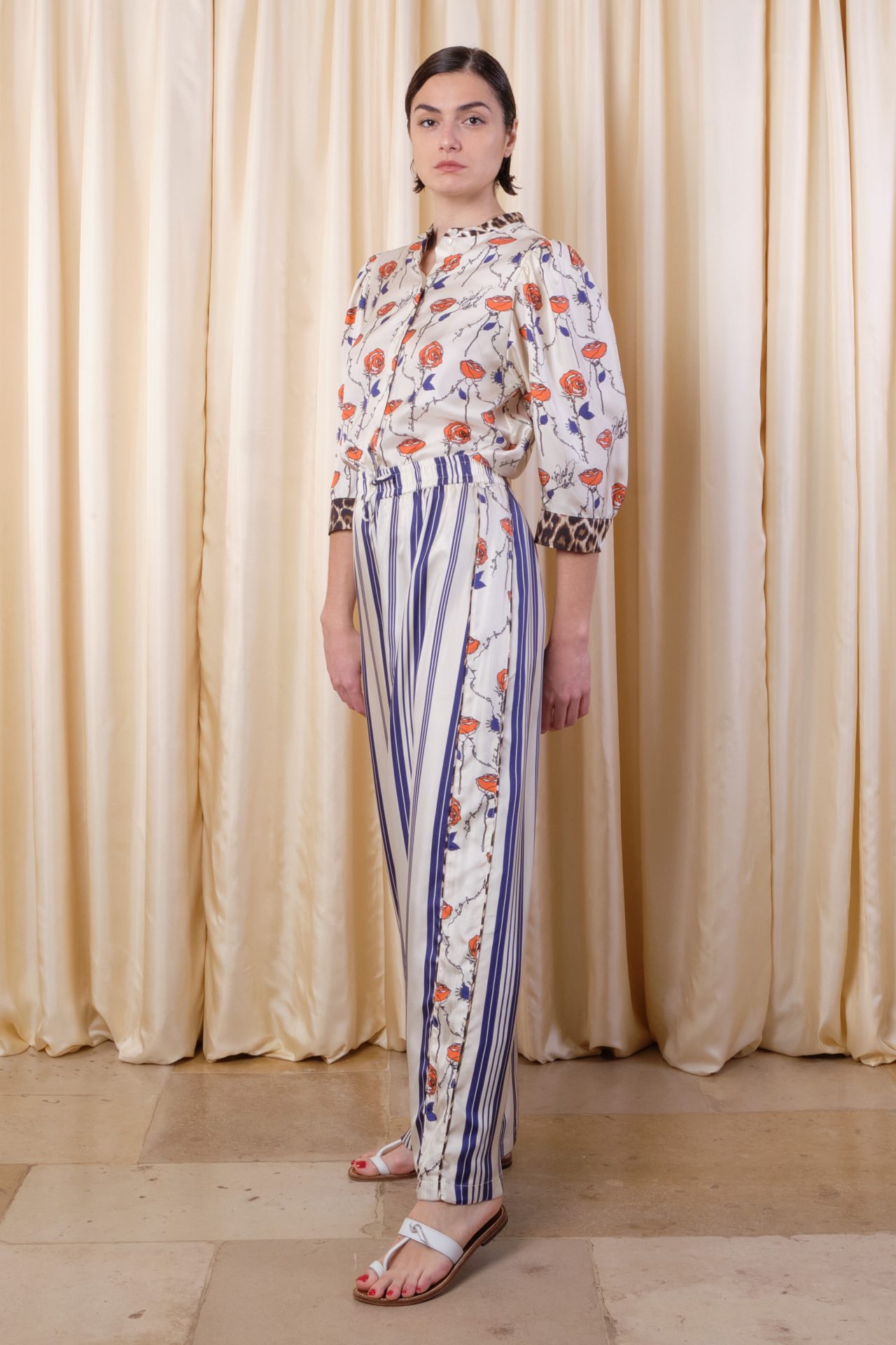Wide skate pants fully in silk twill, elastic and tie at the waist, patched bands on sides with “Panther” piping at the seams. Exclusive prints “Elegance” based on Laurence Kiberlain’s drawings and “Mattress Stripes”.