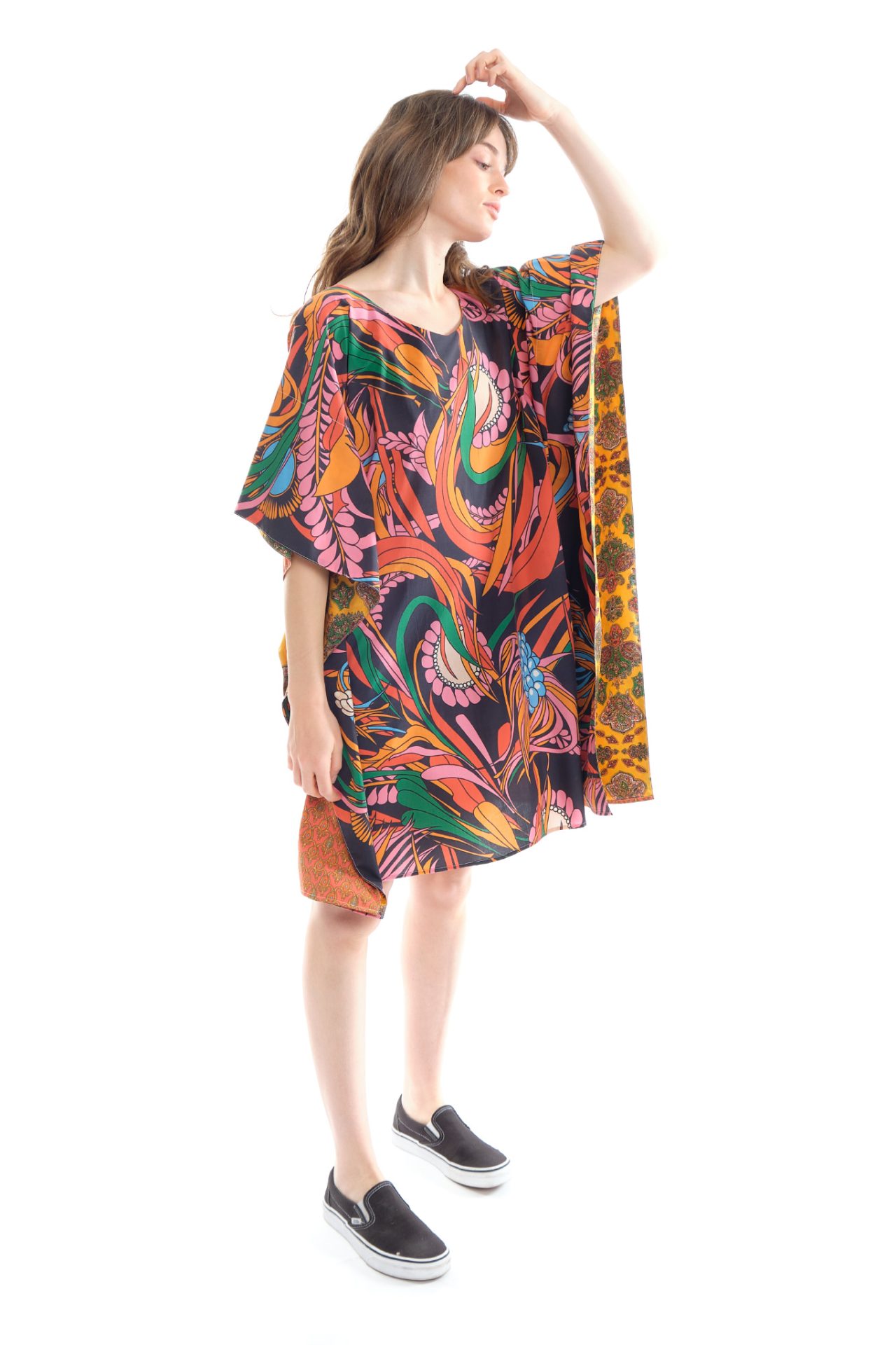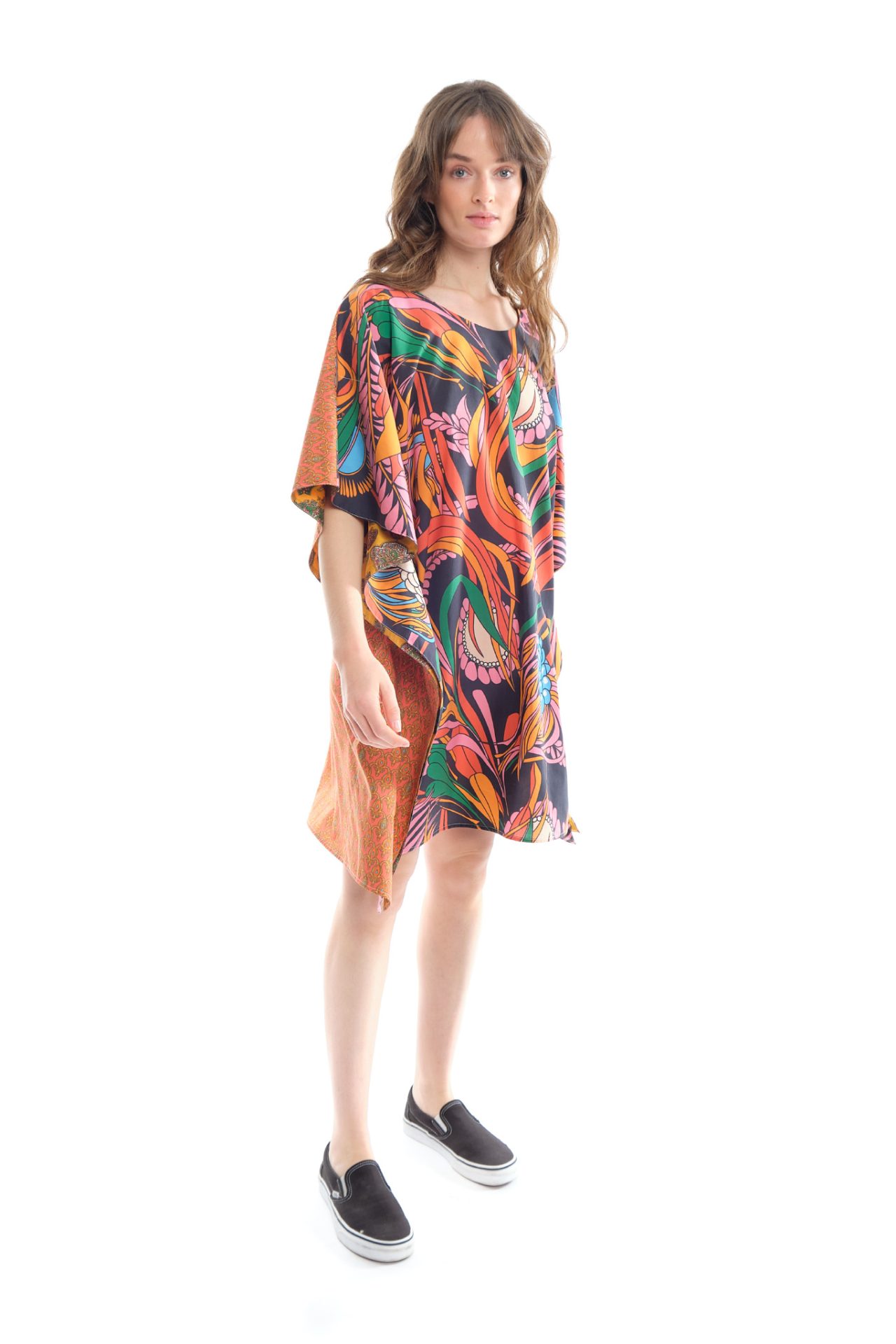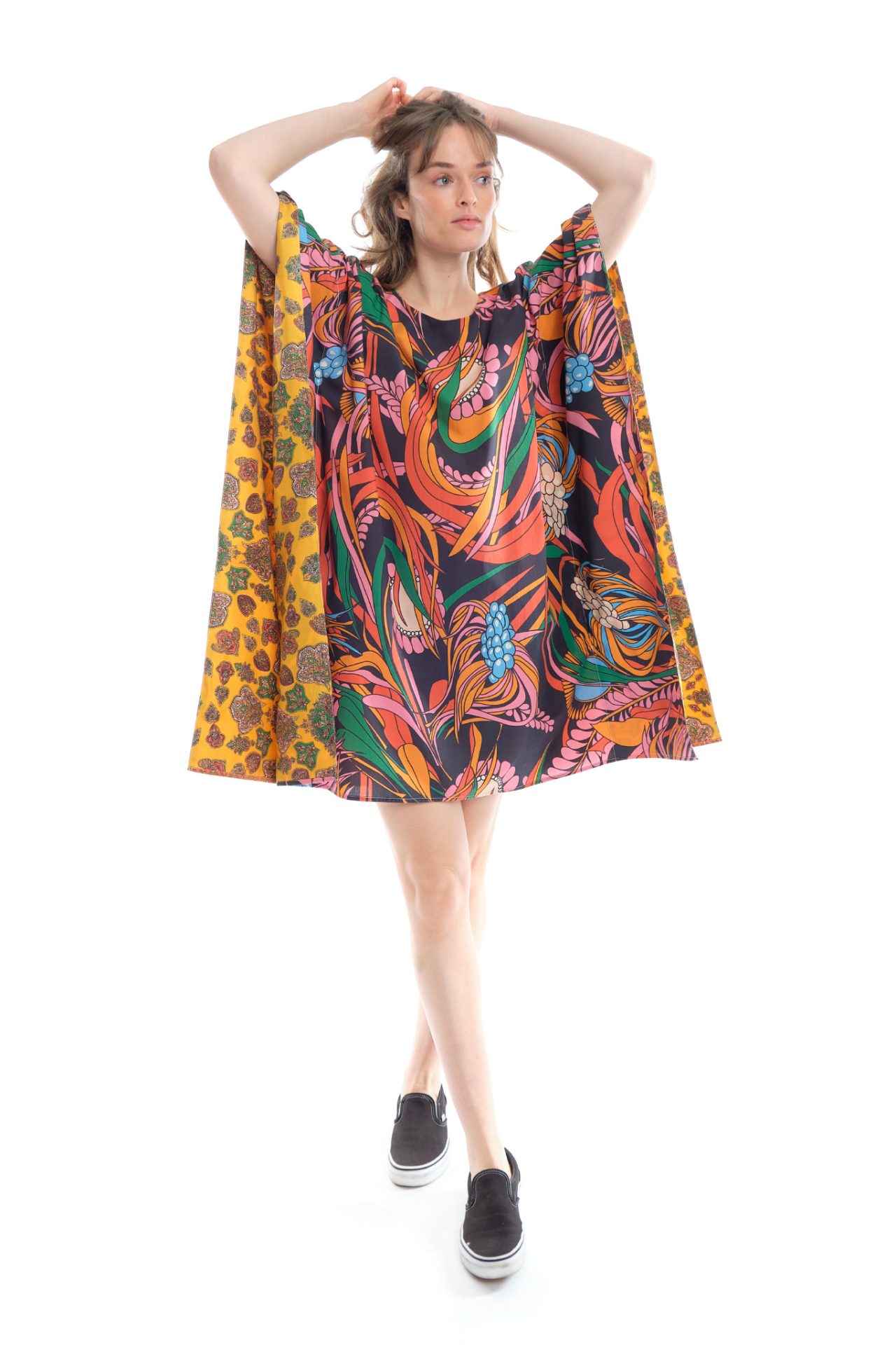 Poncho-inspired dress, exclusive “Corail Fun” print on the front and “Soleil Passion” on the back, with “Cachemire Radial Jaune” print interior details.