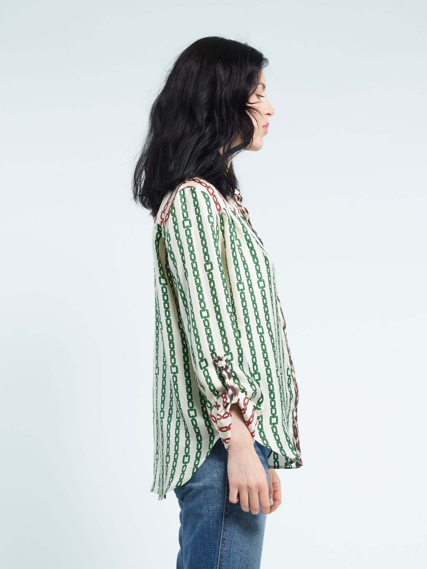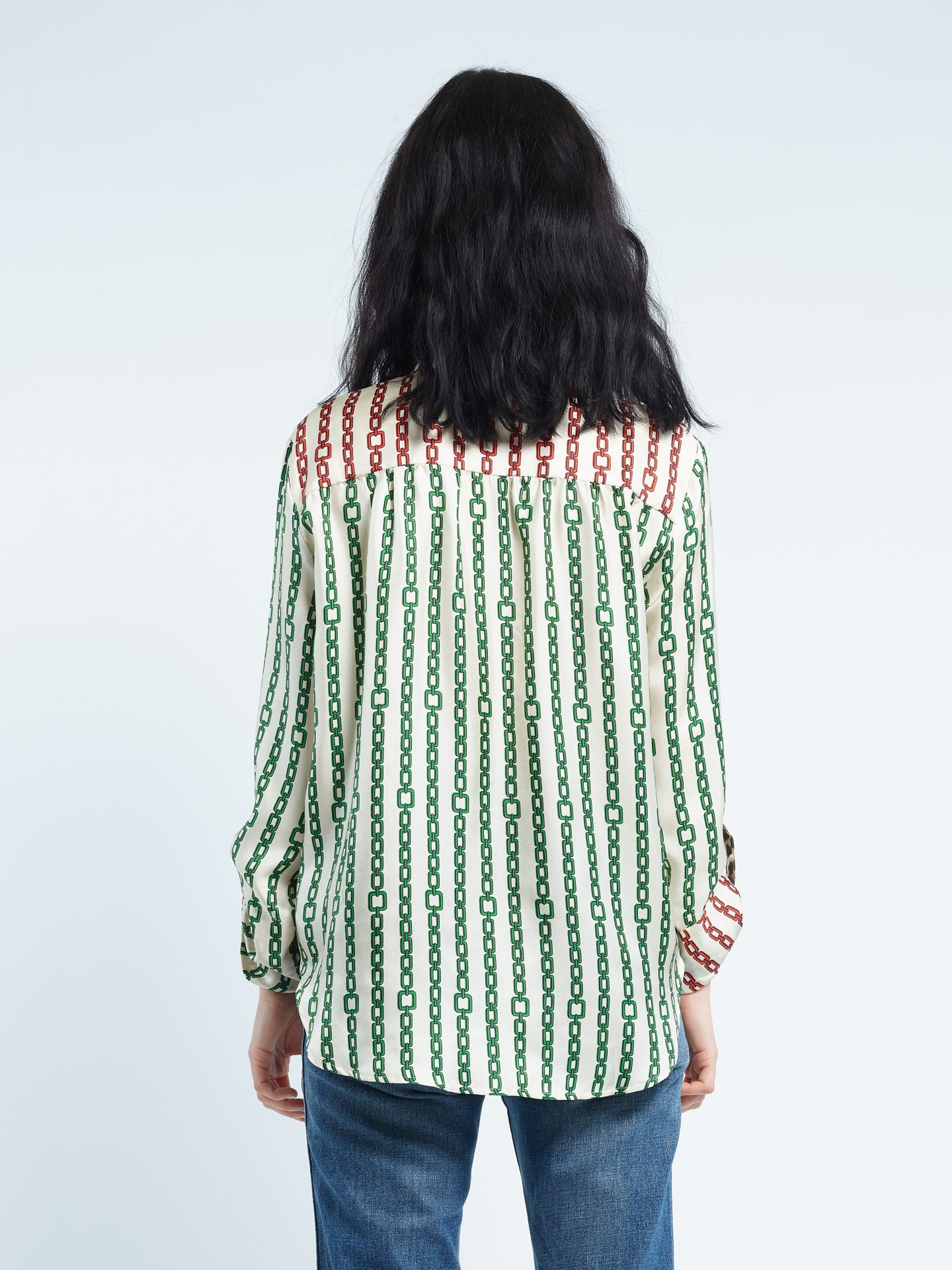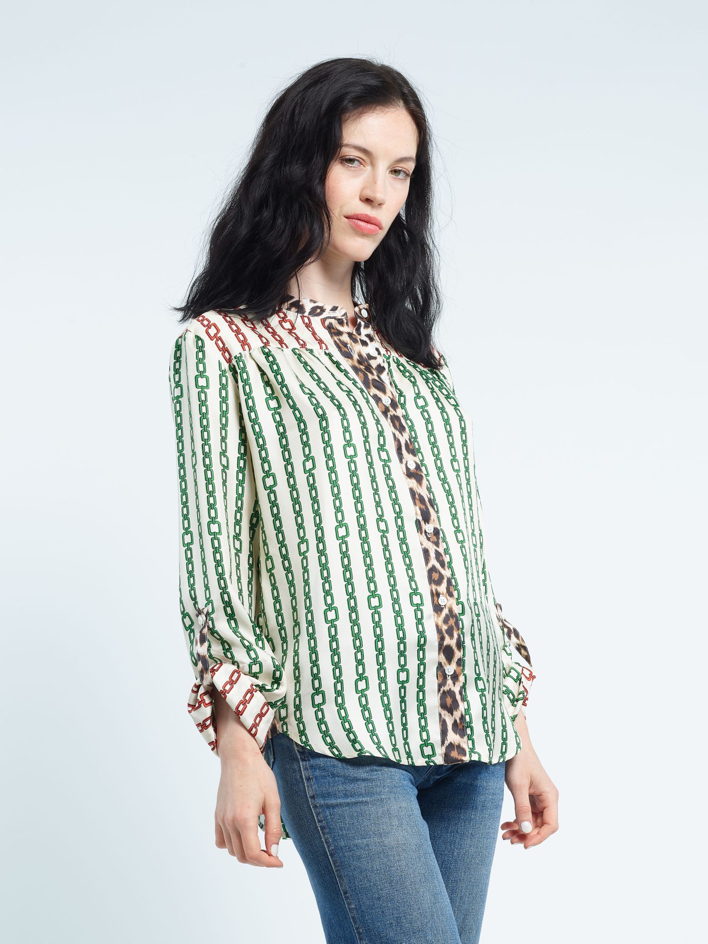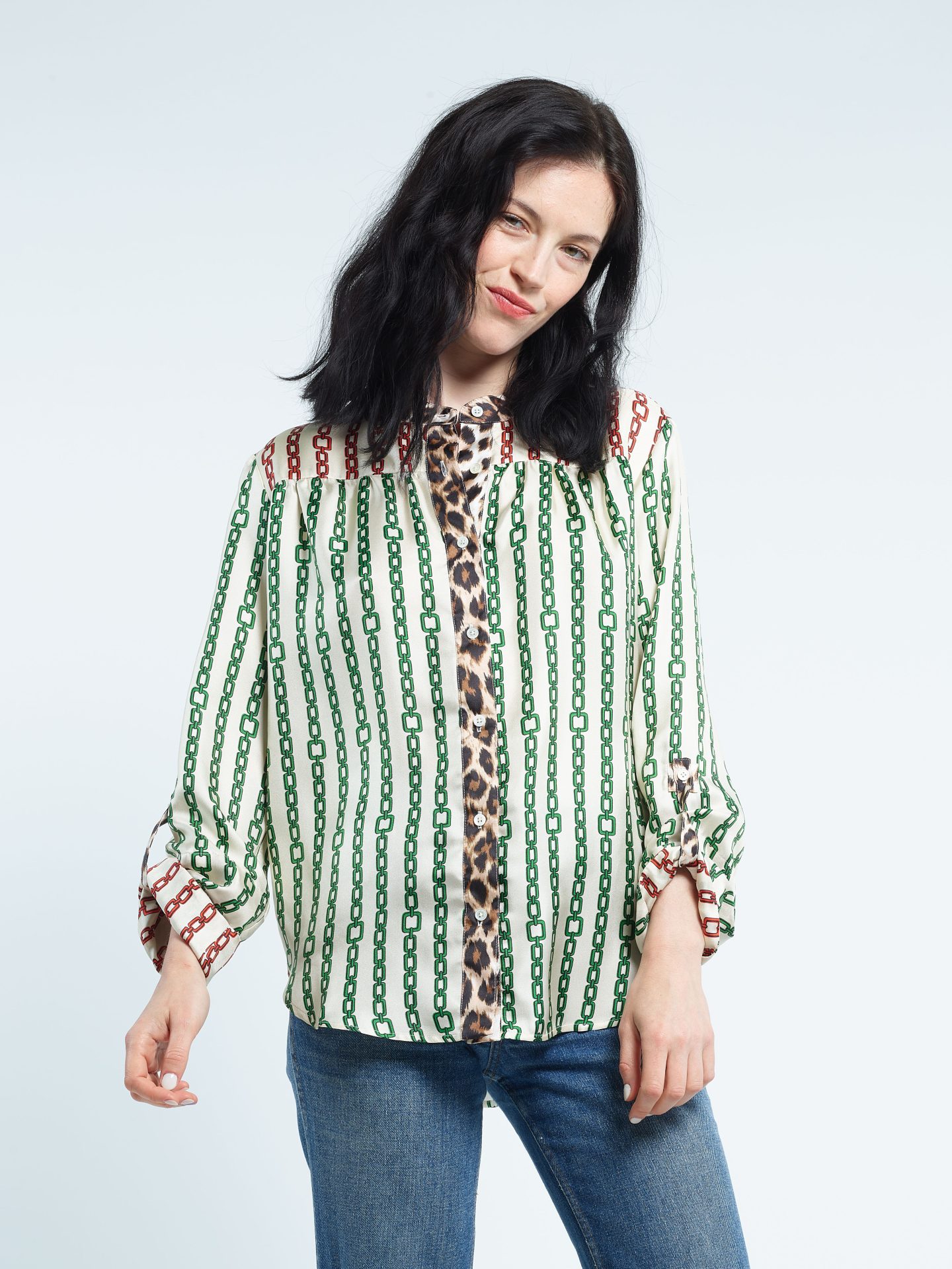 Chemise en twill de soie à manches longues, avec un retour et une patte d’accrochage pour se retrousser, entièrement boutonnée avec col mao, boutons en nacre. Imprimé exclusif “Chaînes” en deux coloris et details “Panthère”.