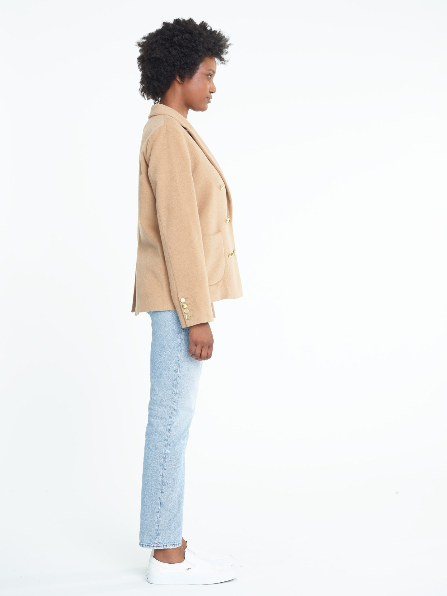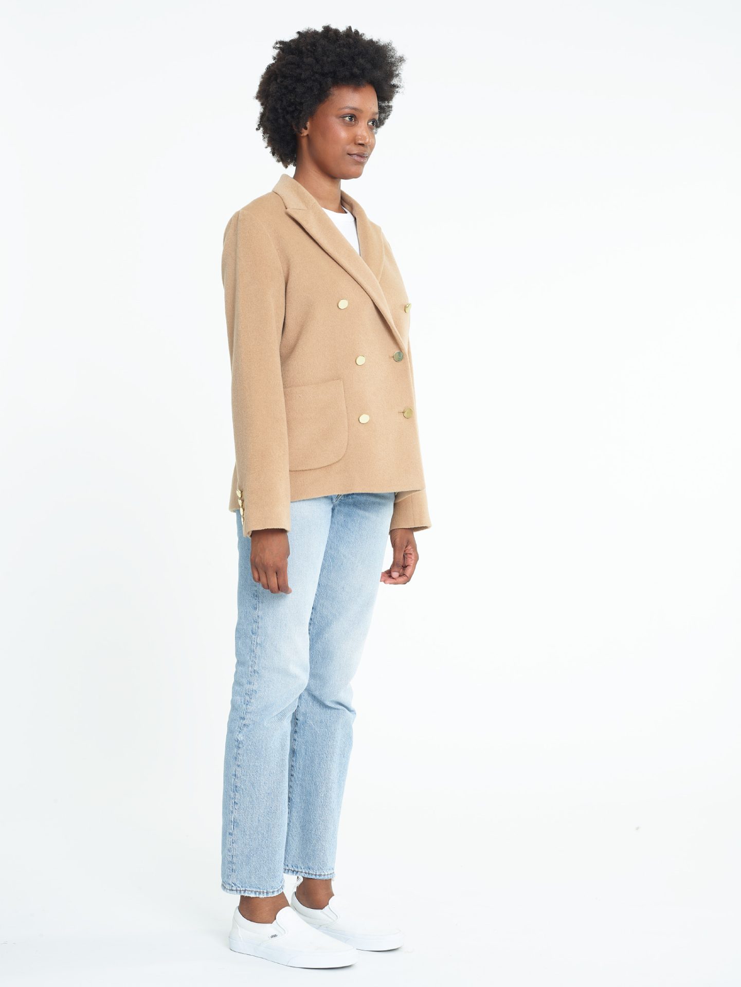 Veste droite, col tailleur, deux poches plaquées devant, 6 boutons, boutonnage croisé, bord franc, fente au dos.