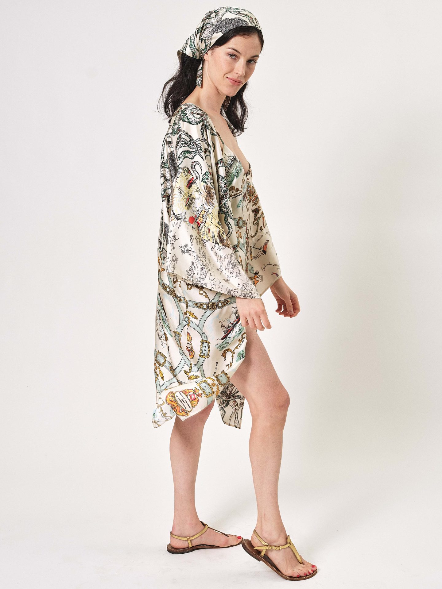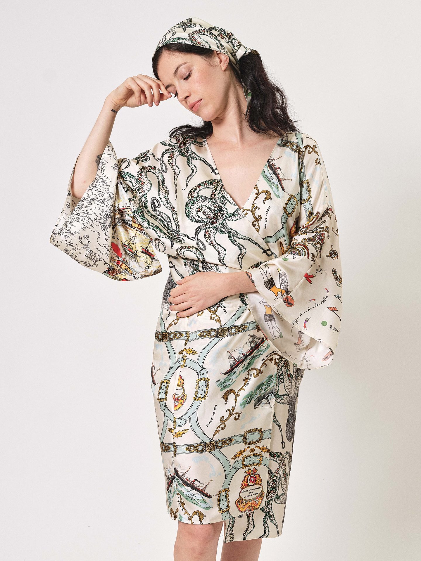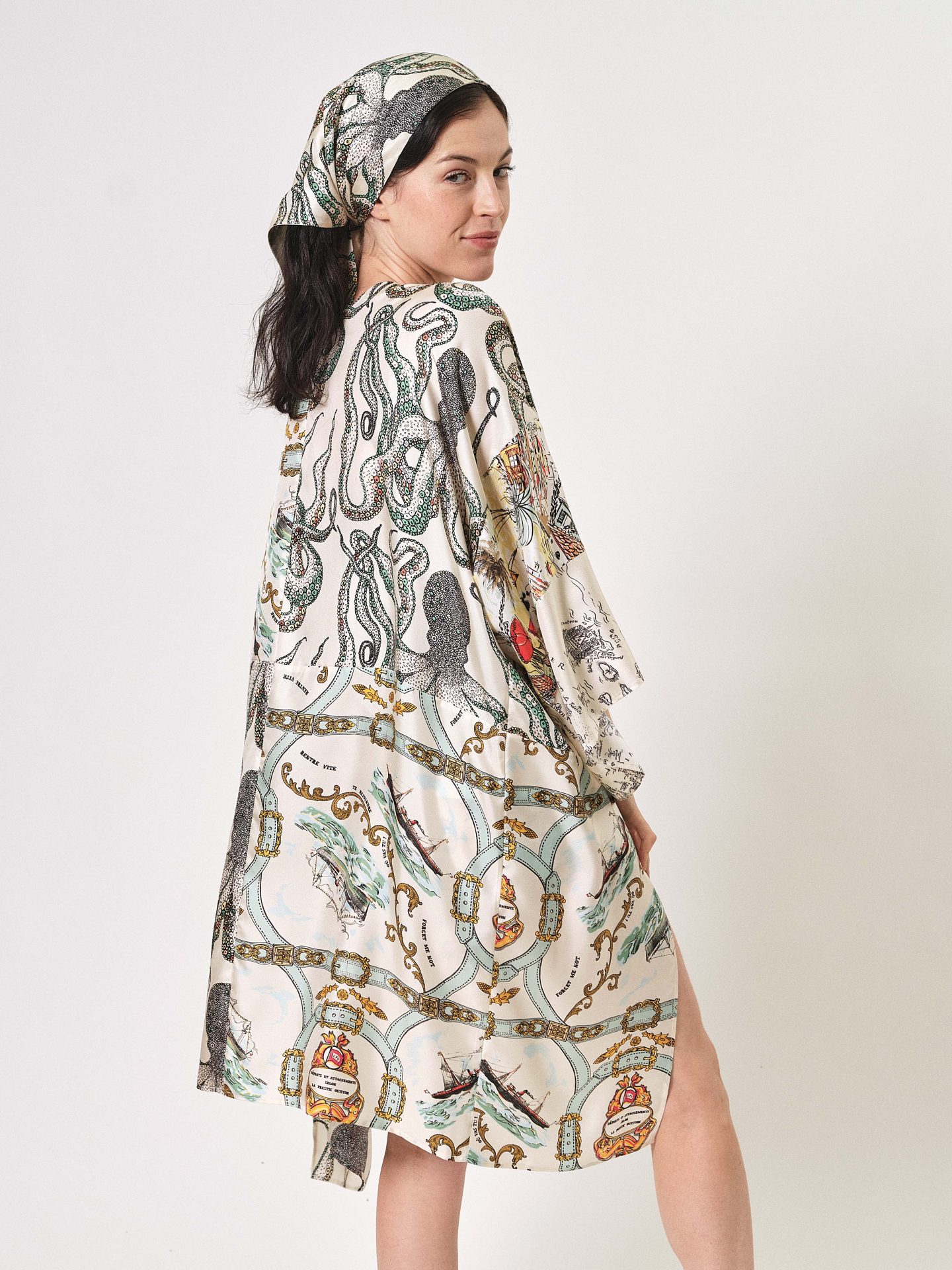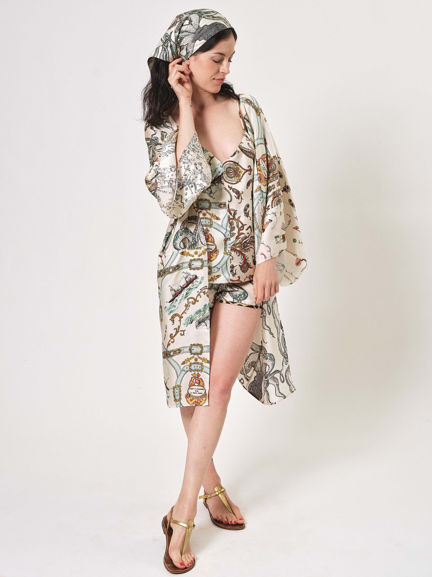 Long kimono en quatre panneaux, col v, tout en twill de soie. Imprimés exclusifs “Pieuvre” d’après les dessins de Laurence Kiberlain et “Attachement”. ”Calcutta”, “Golfeuse”, “Carte” et “La Dolce Vita” sur les manches.