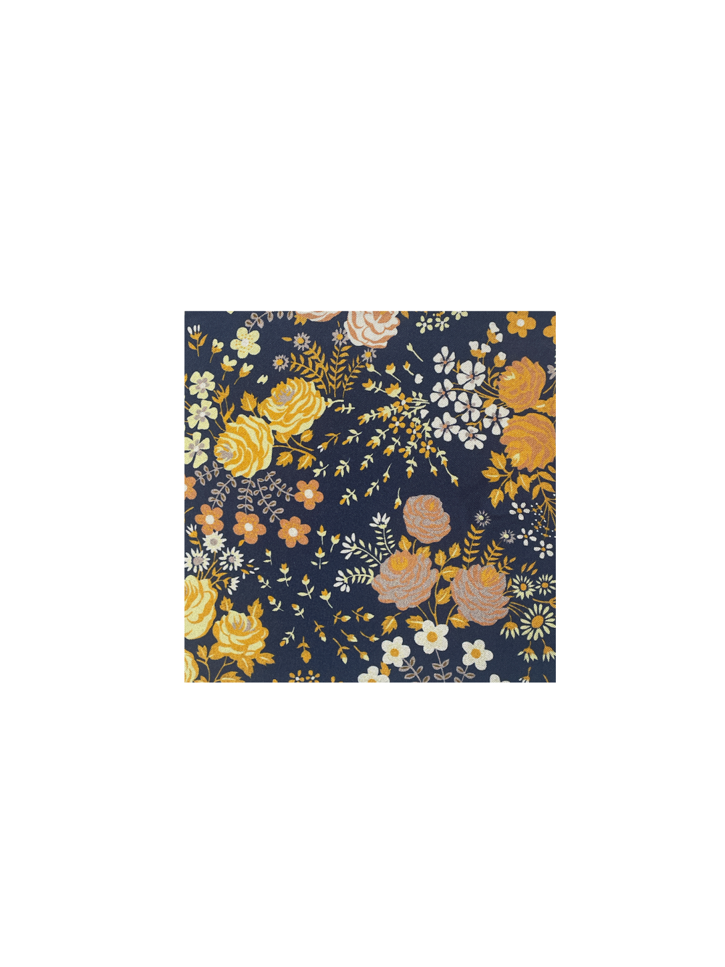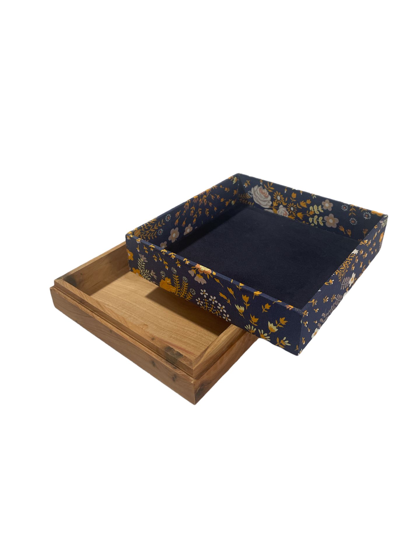 Moyenne boîte en bois de tuya, recouverte de twill de soie, imprimé exclusif « Fleurs campagne », intérieur de couvercle en suédine. Fait main au Maroc.