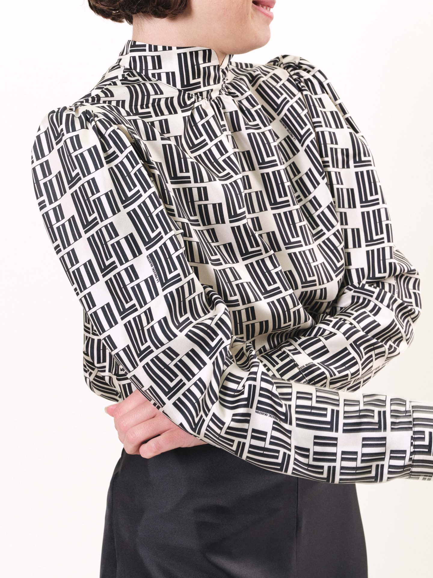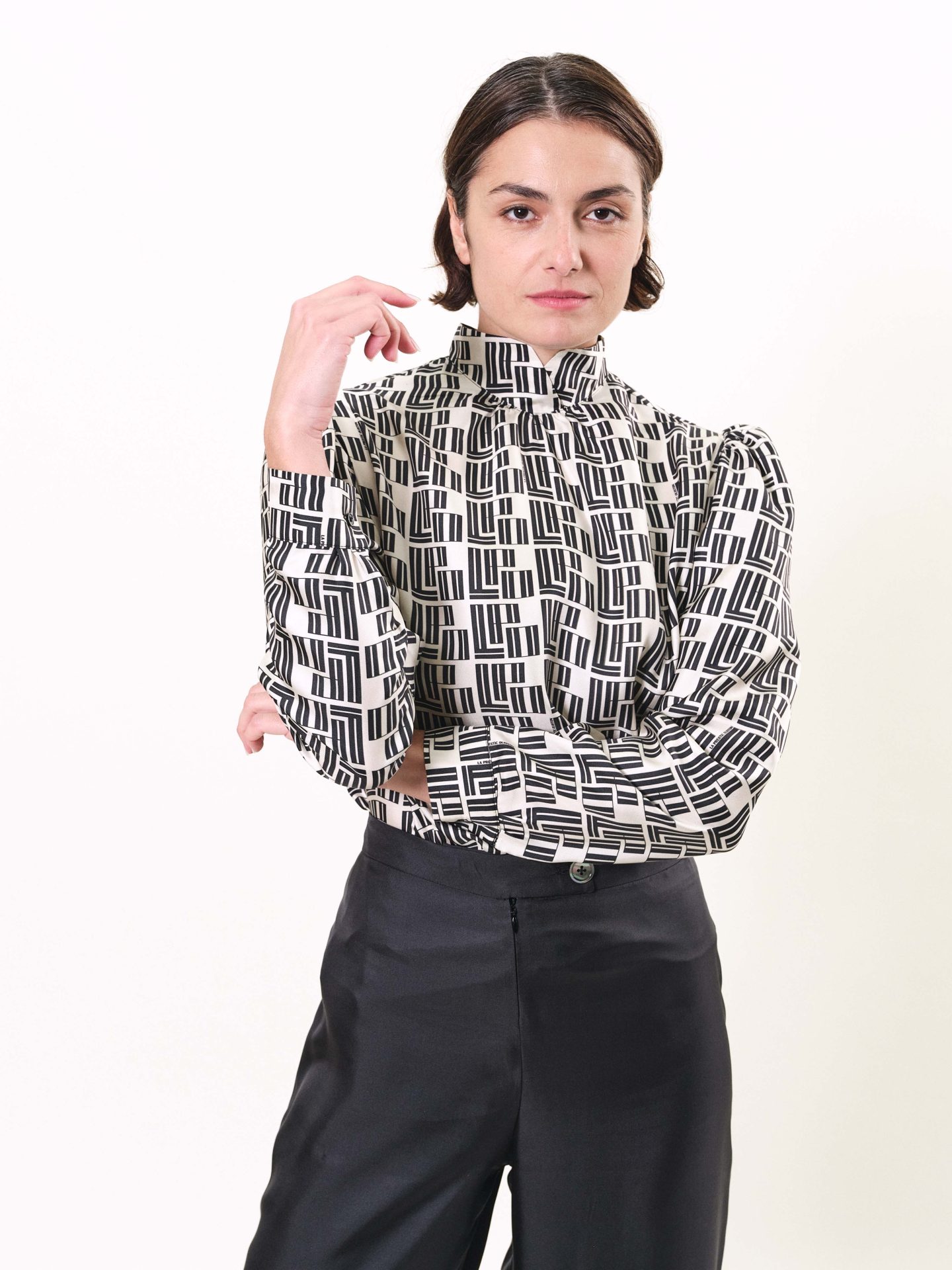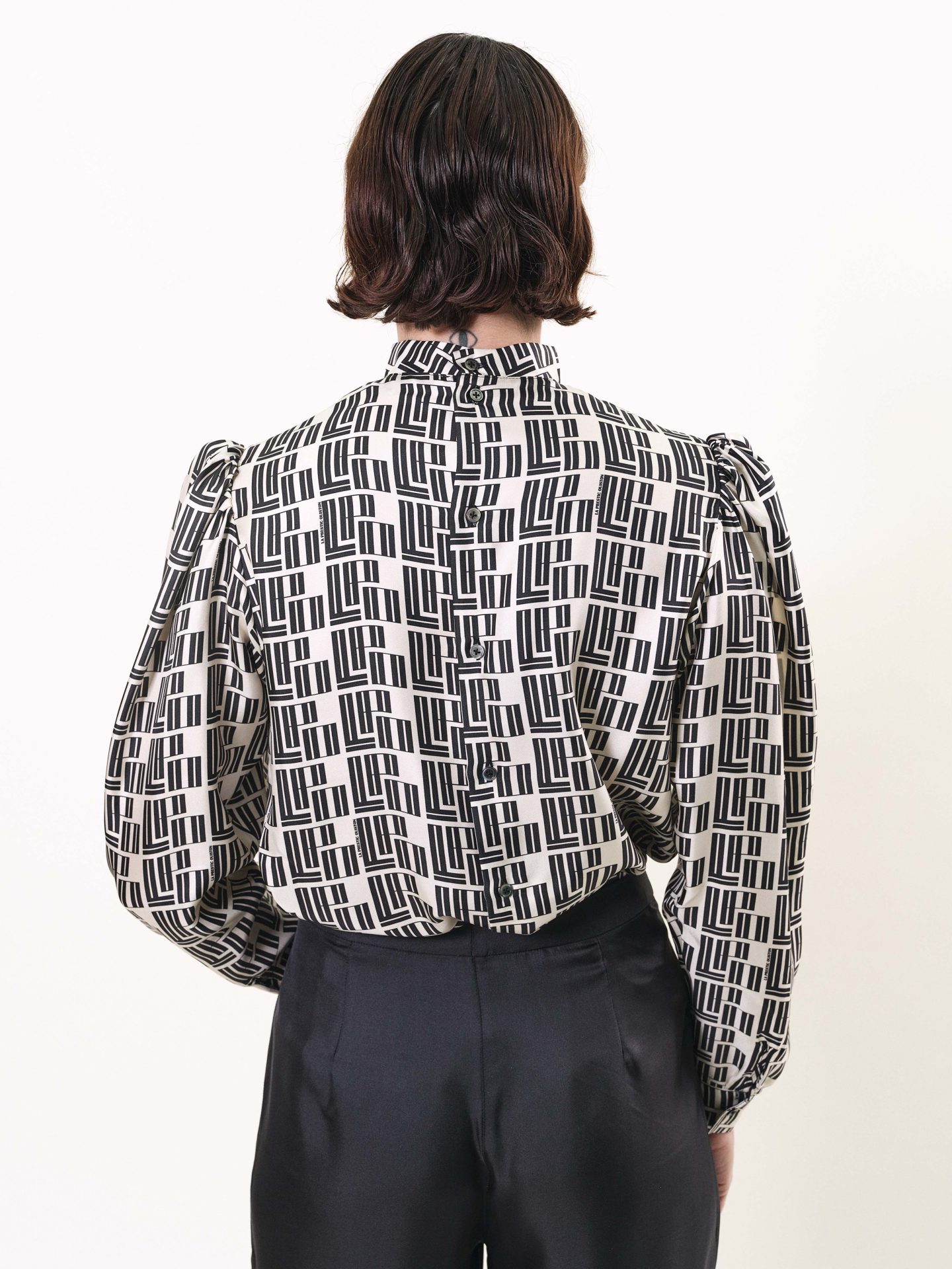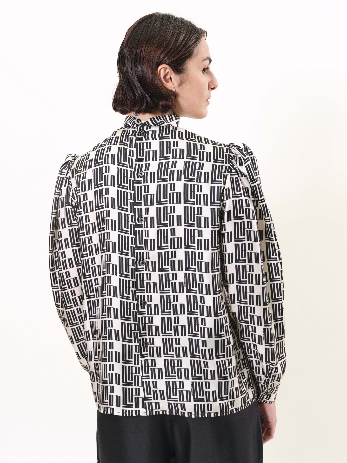 Blouse style vintage en twill de soie, épaules plissées, boutons recouverts de soie tout le long du dos. Imprimés exclusifs “LPO Monodéco”.